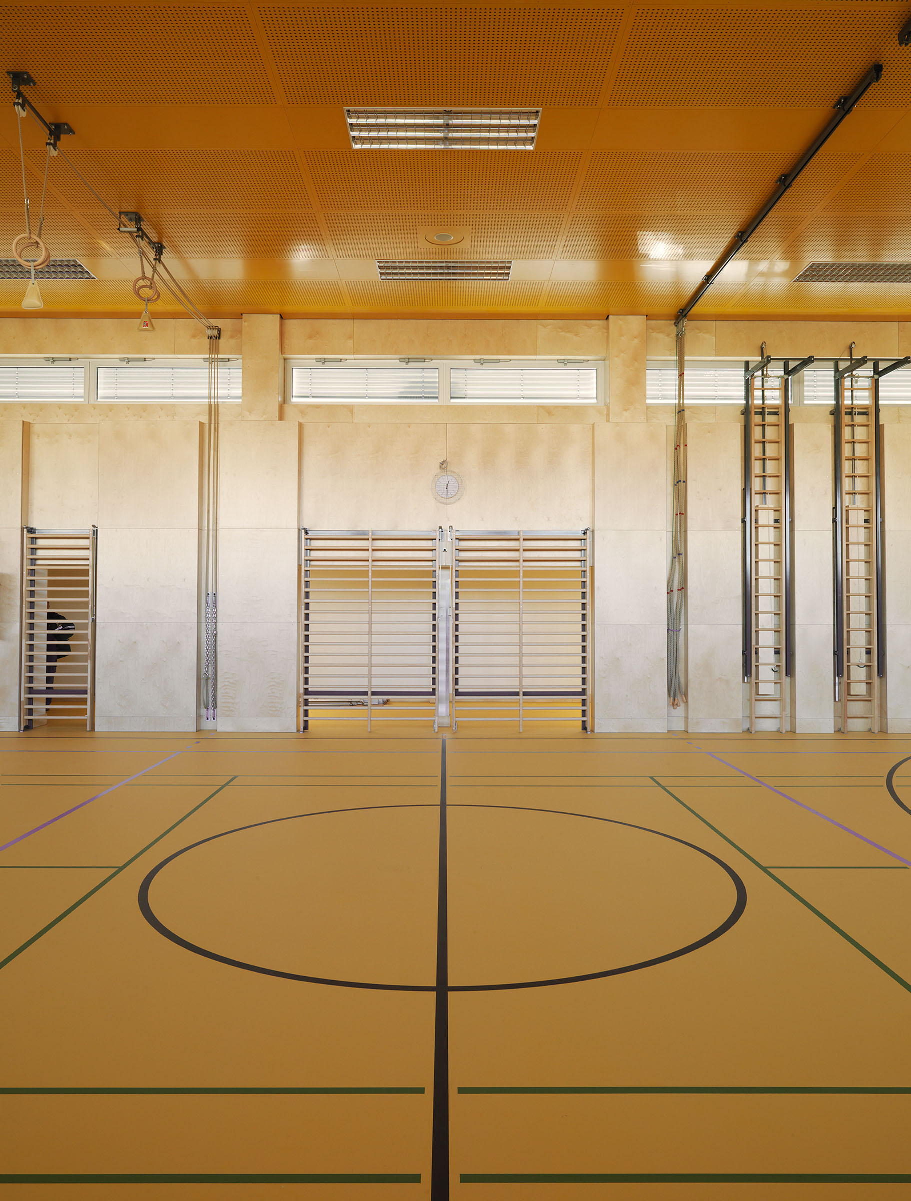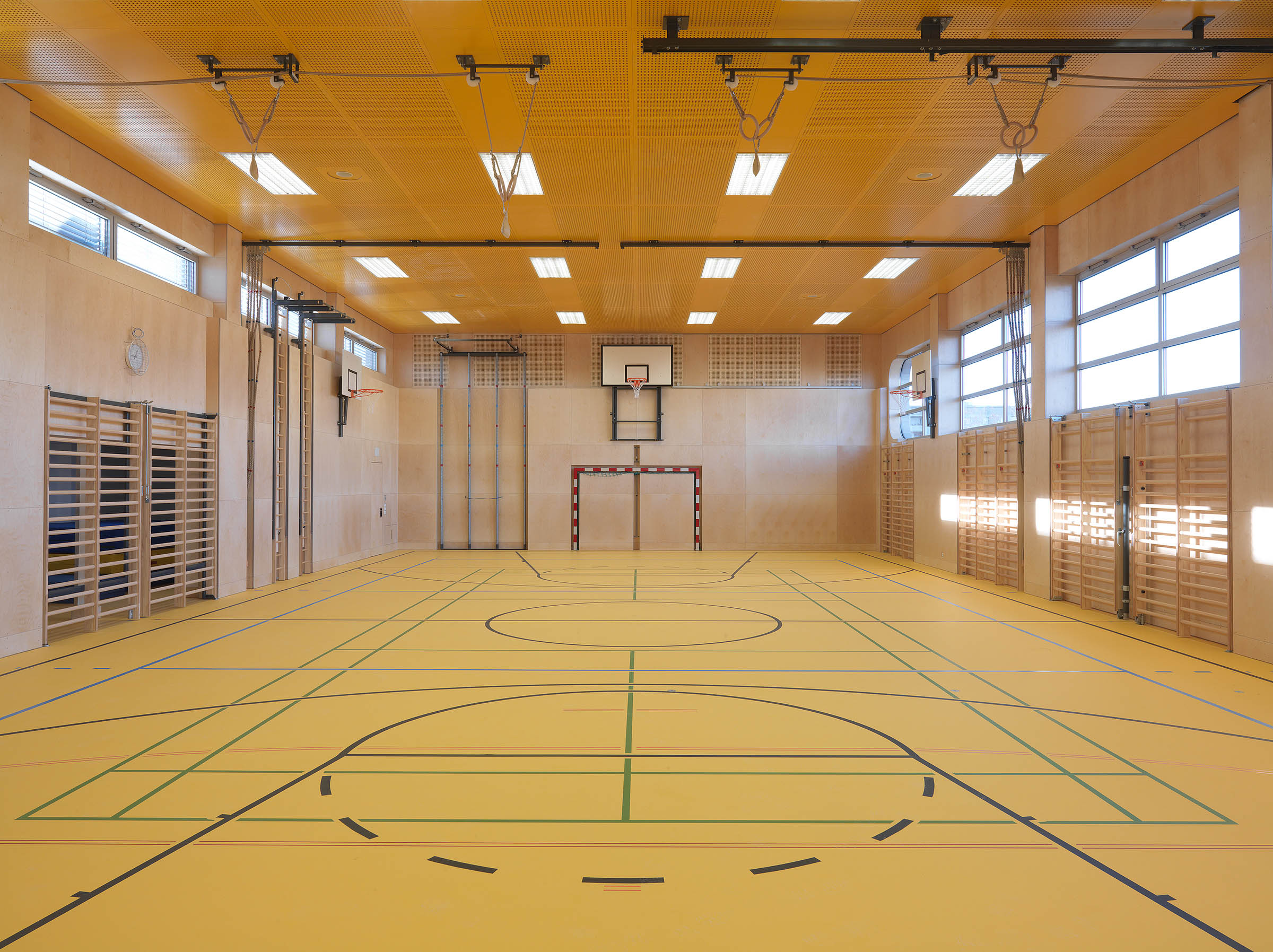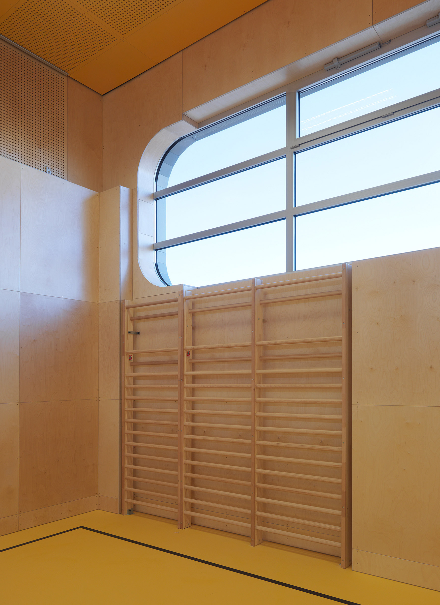 The new construction of the gym presents itself outwards as a closed block, faced with pre-patinized zinc sheets. The inside is dominated by shades of yellow, unusual for this type of building: yellow linoleum for the floor, ceiling and walls fully faced with birch wood and painted yellow – together, this results in an unusual, warm and cheerful atmosphere.