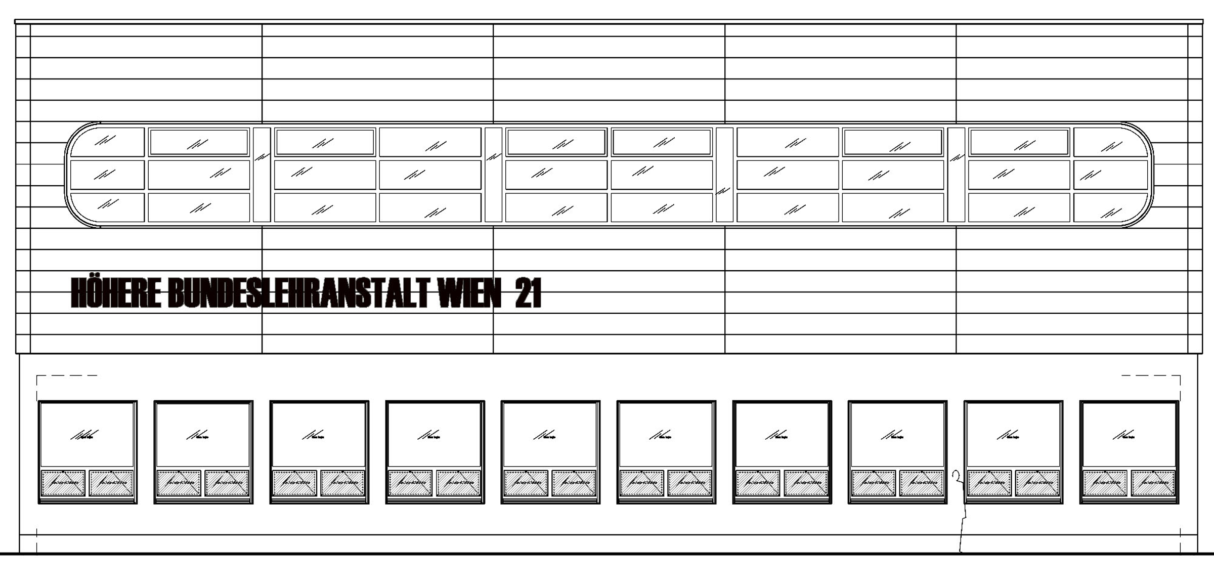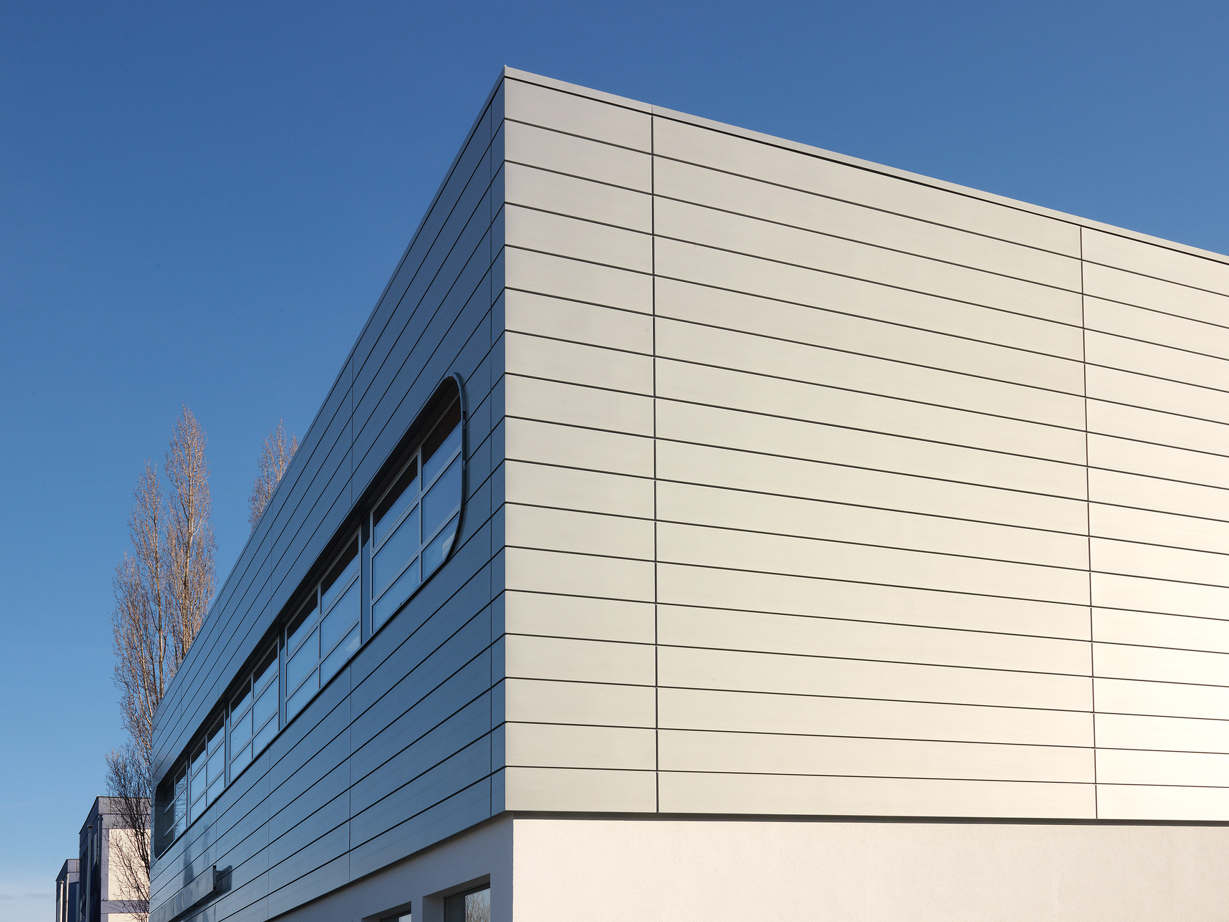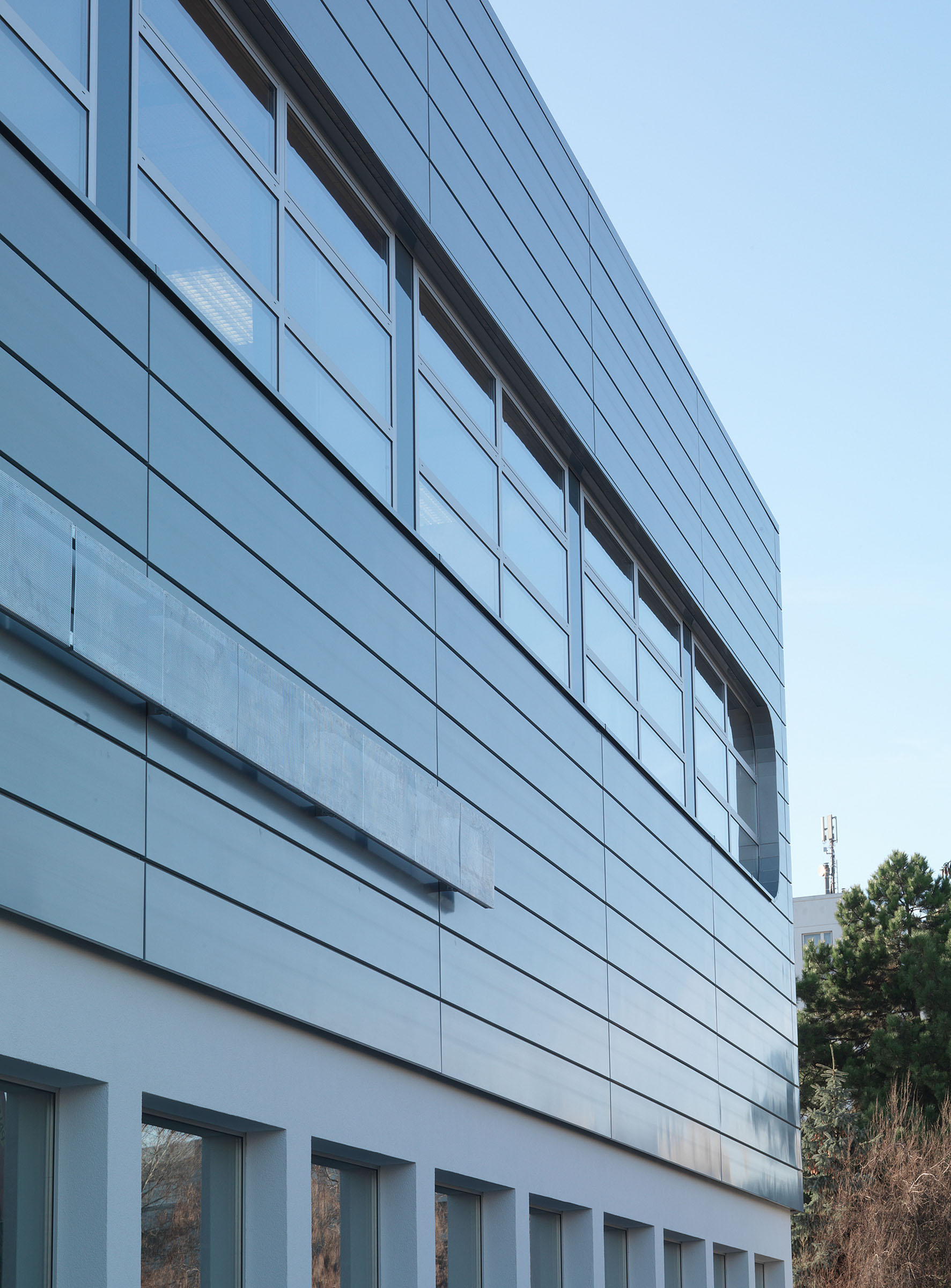 The new construction of the gym presents itself outwards as a closed block, faced with pre-patinized zinc sheets. The inside is dominated by shades of yellow, unusual for this type of building: yellow linoleum for the floor, ceiling and walls fully faced with birch wood and painted yellow – together, this results in an unusual, warm and cheerful atmosphere.