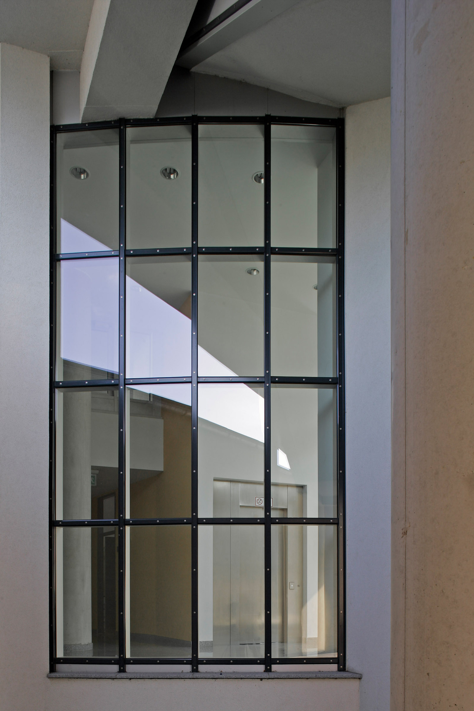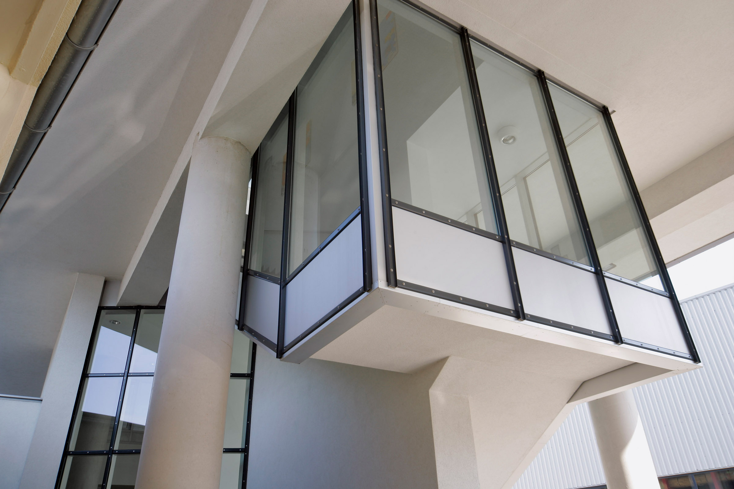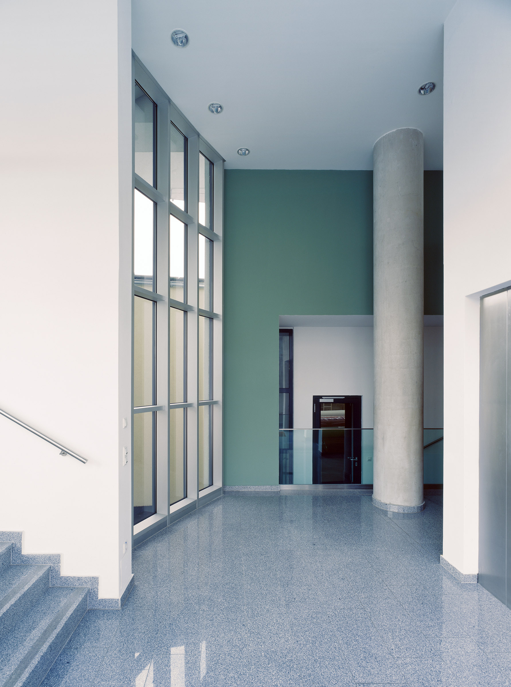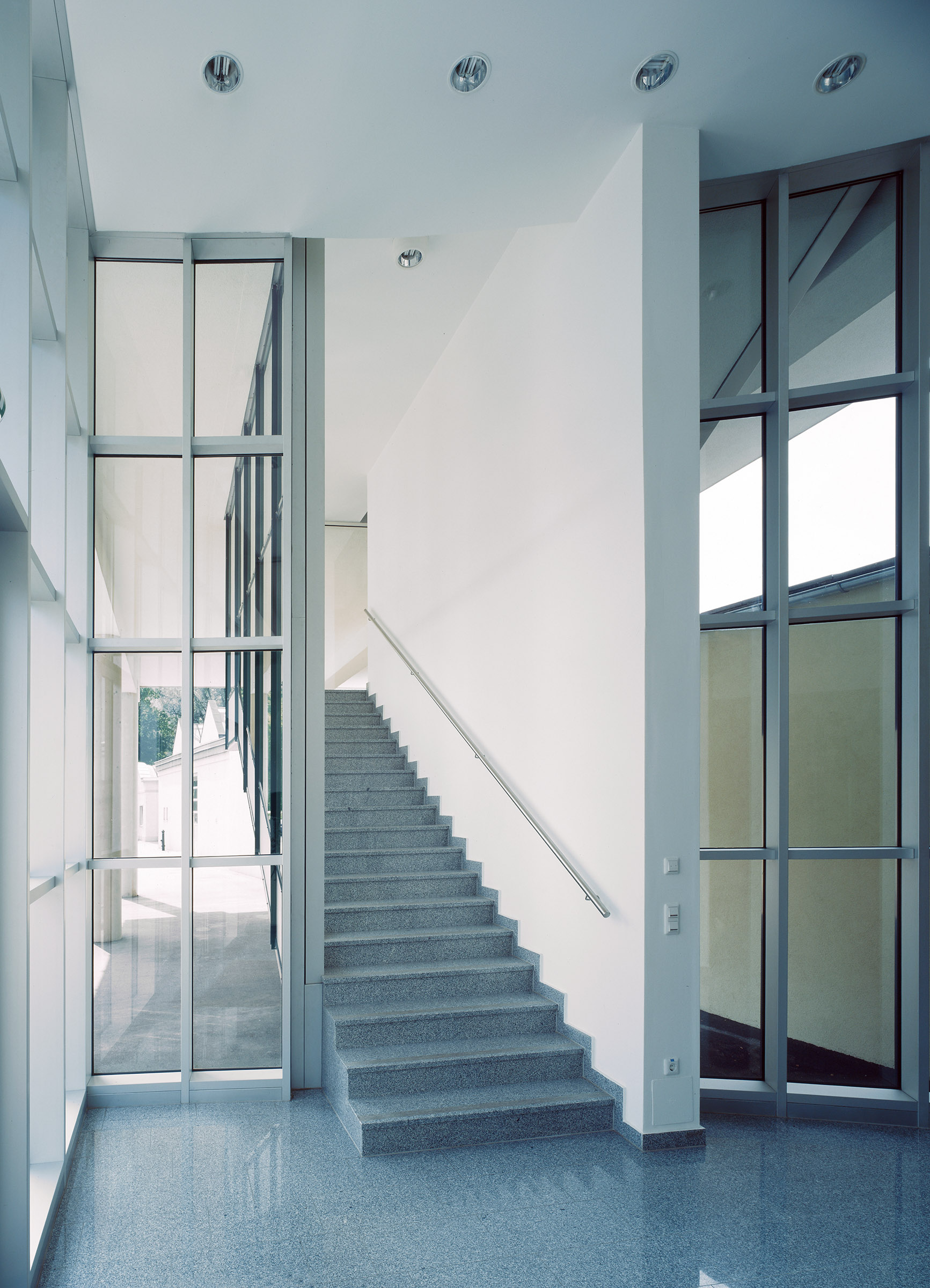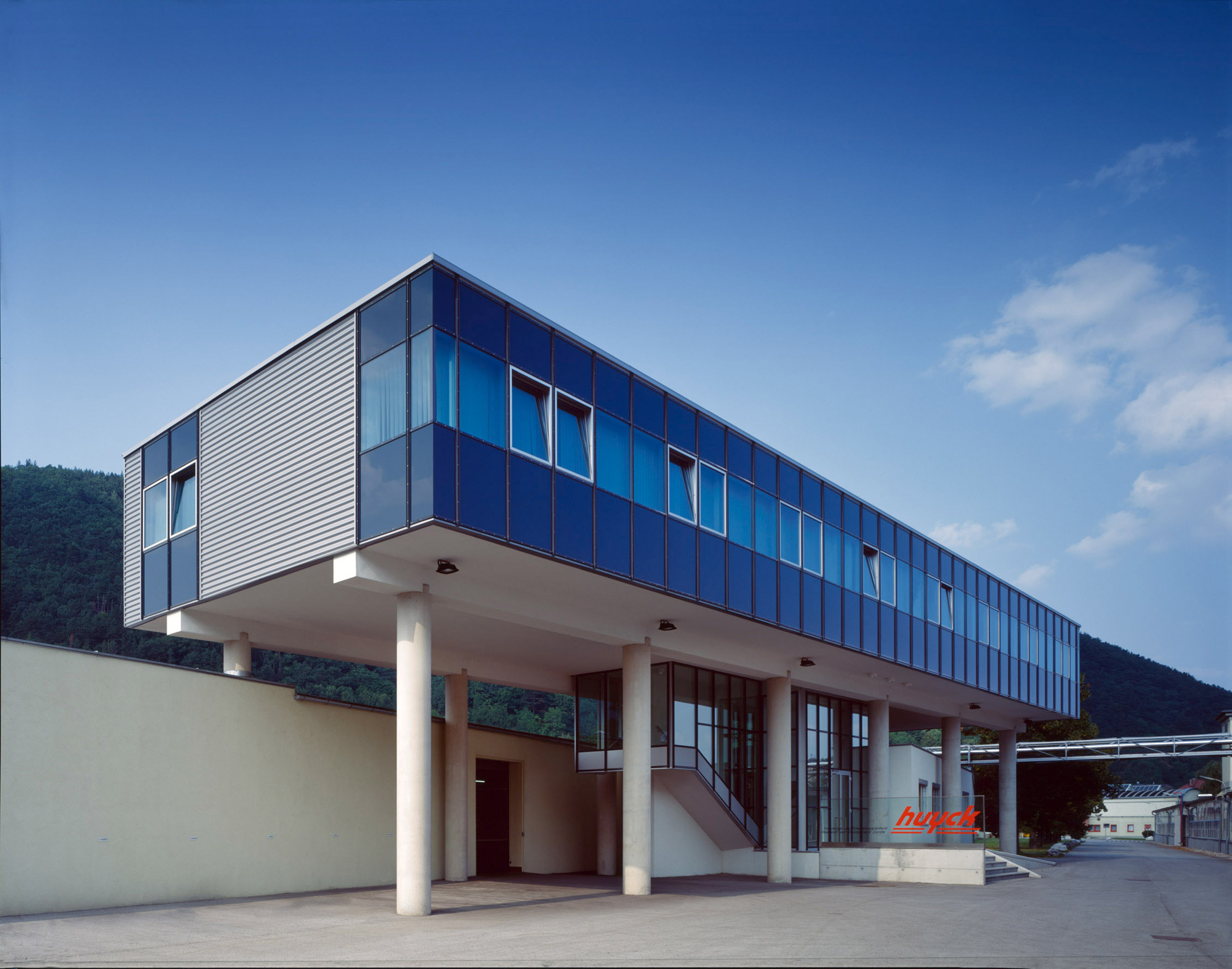 This research center was designed for a producer of felt for paper production. The clear, cubic construction on twelve pillars made of reinforced concrete was connected to an existing building by rotating the main body. The enamelled glass facade sets a confident accent in the alpine landscape, and at the same time serves as a modern introduction of the corporation.