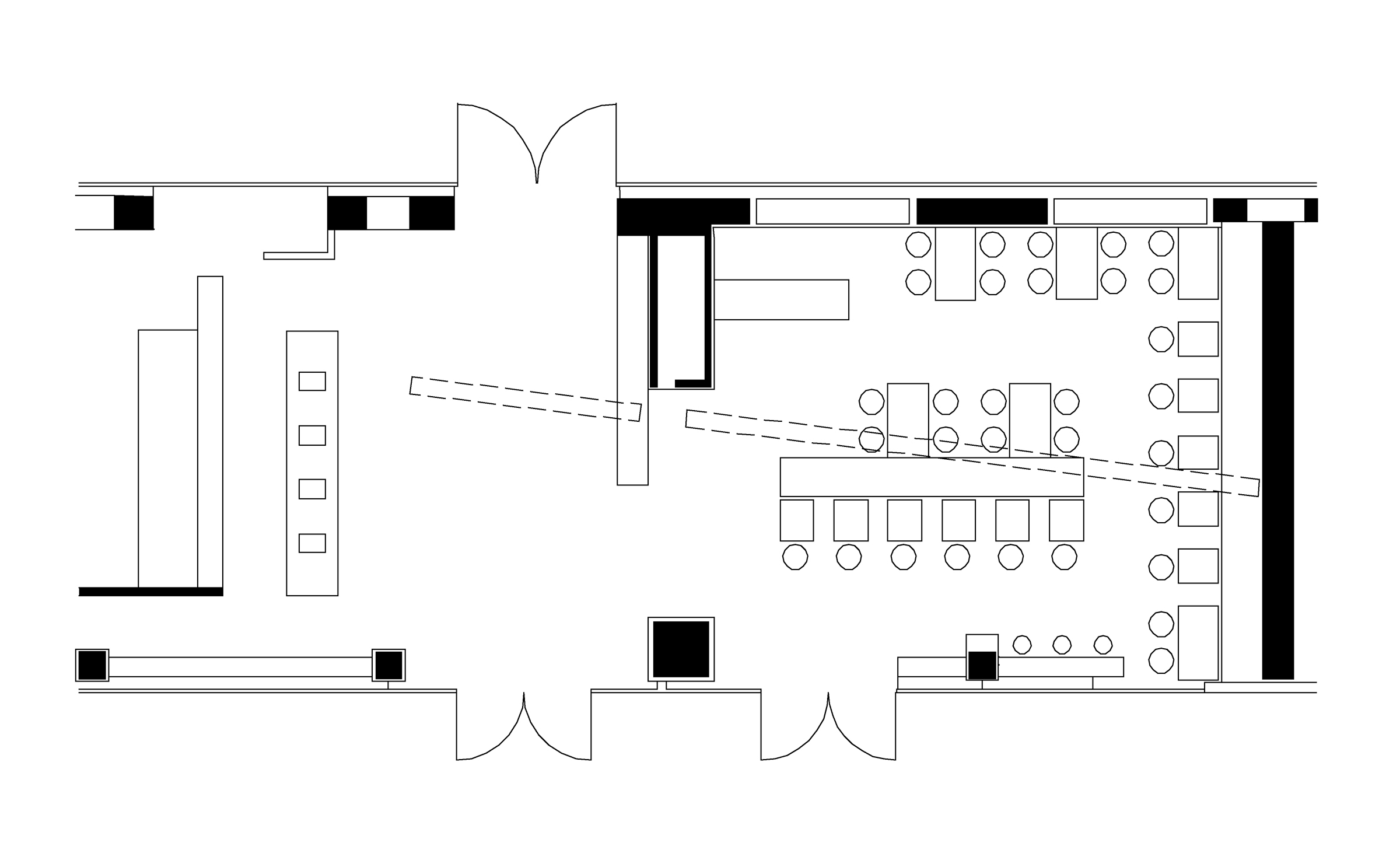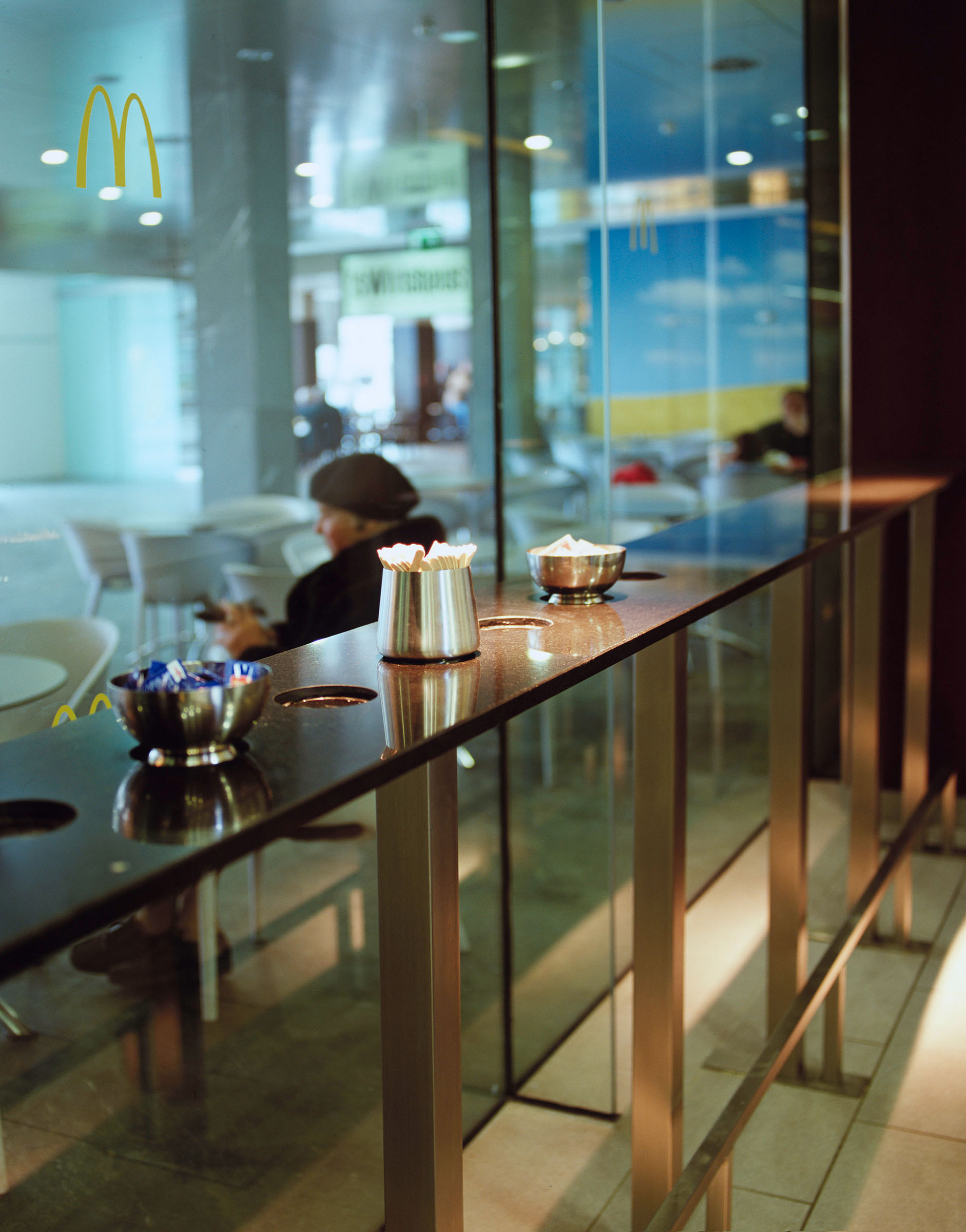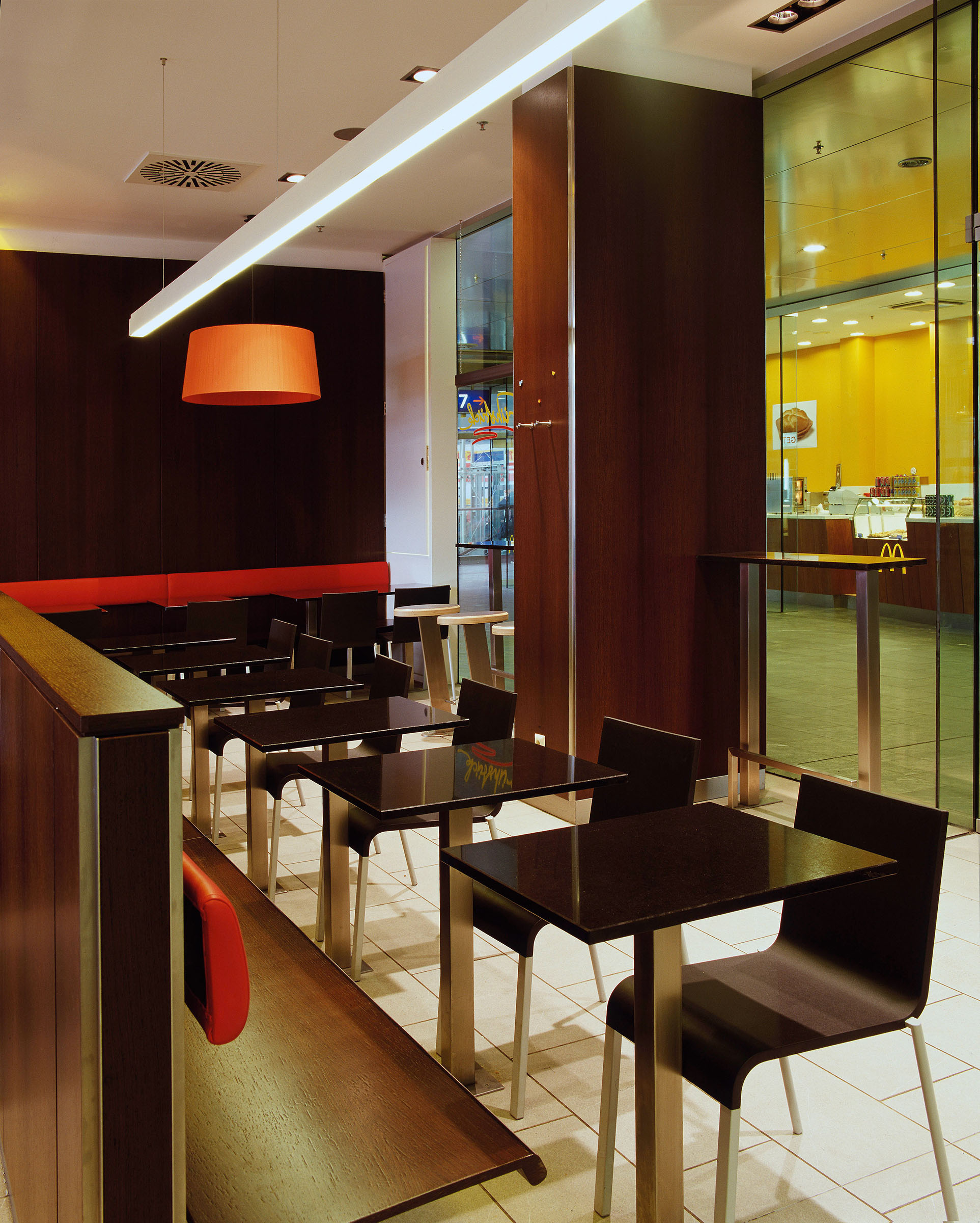 The design of this restaurant at the train station, the entryway to the city, is a tribute to the city of architects Graz. A sophisticated formal language and an unusual colour concept create an urban atmosphere, the linear yellow ceiling motif restructures the space and creates mirror effects on the surfaces.