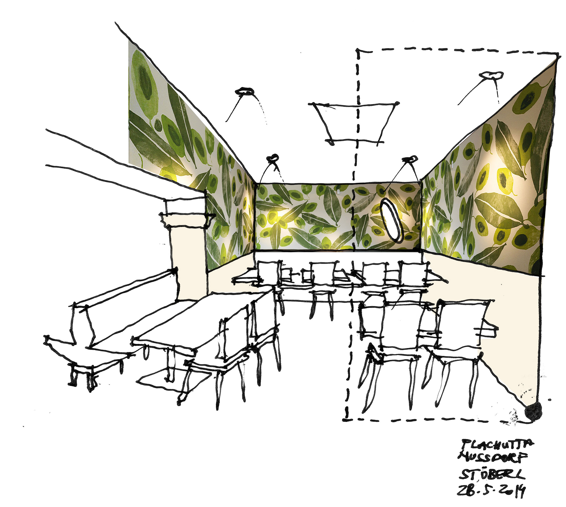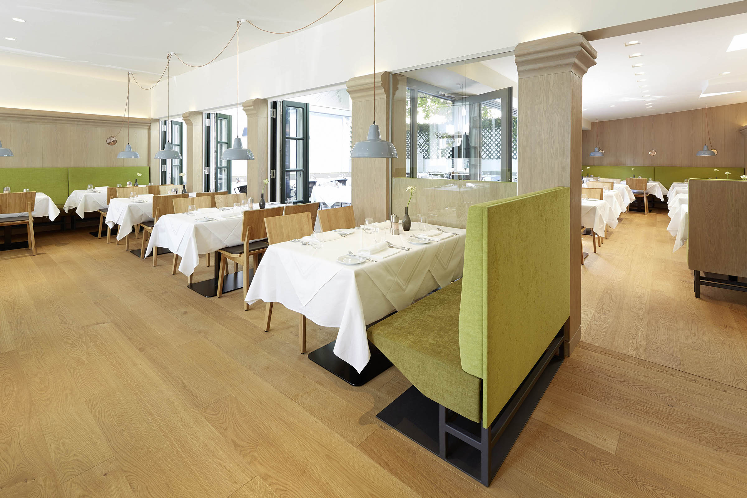 The restaurant in the 19th district has been completely renovated. High-quality materials and color accents create a fresh atmosphere in this traditional establishment. The new interpretation of the classic tavern lamperie and the “Nusswand” by artist Katharina Frey accentuate the individual rooms. Large sliding elements of the new conservatory and new French windows create a seamless transition between the interior and the courtyard garden.