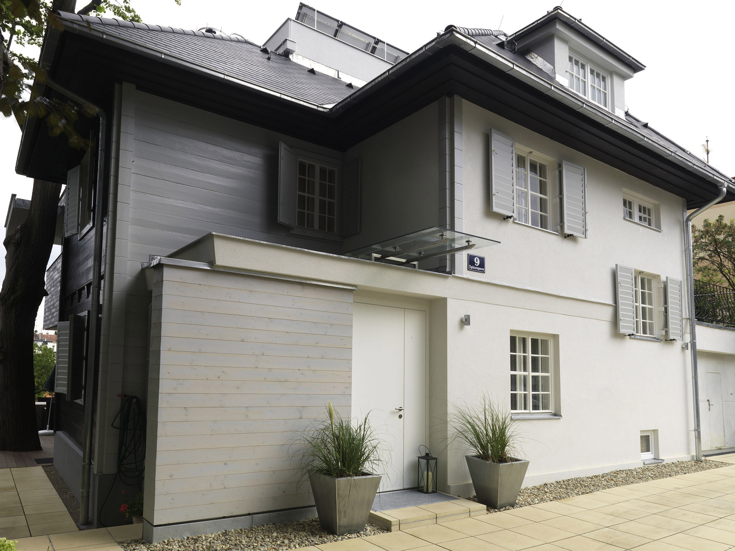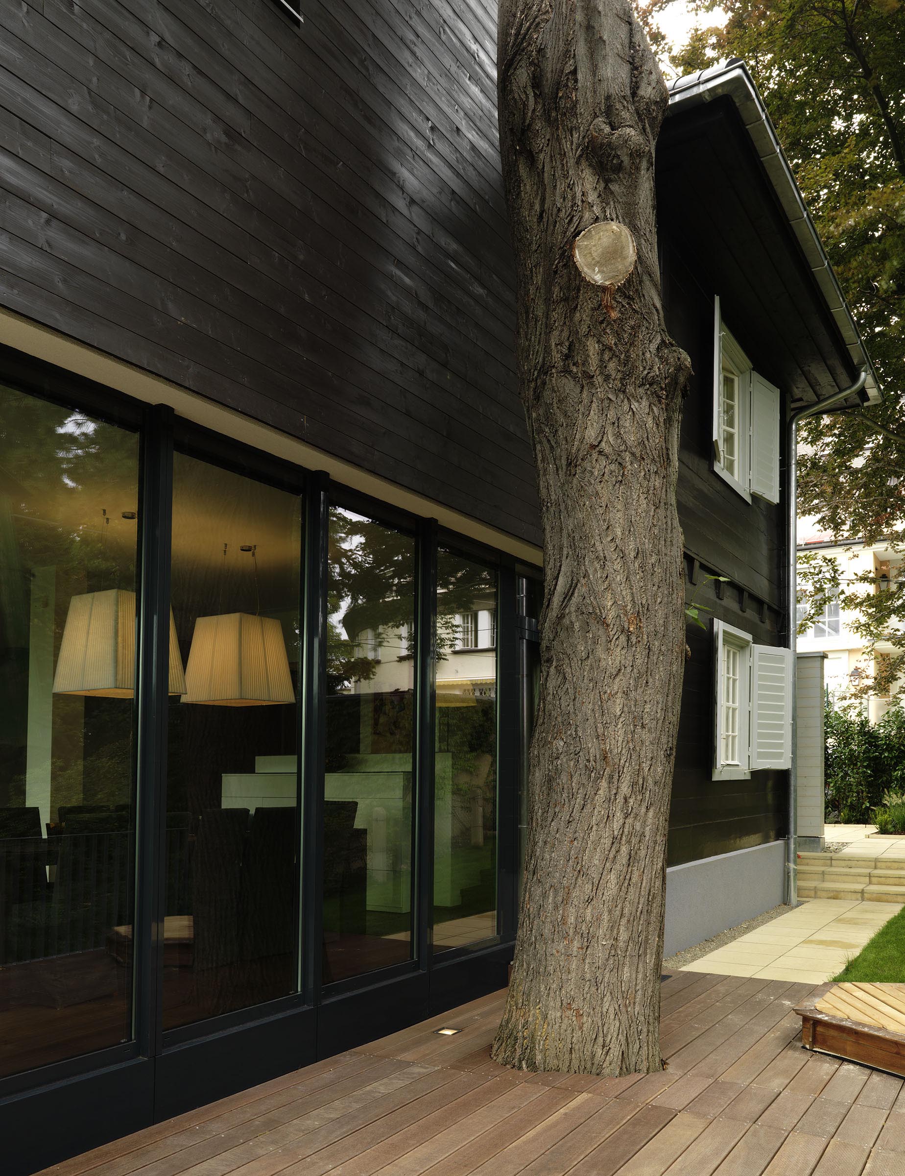 A drastic reconstruction preserving only the façade facing the street created a symbiosis of restraint and generosity. While the conventional design of the house on the outside seems almost anonymous, the open structure towards the garden speaks a modern architectural language.