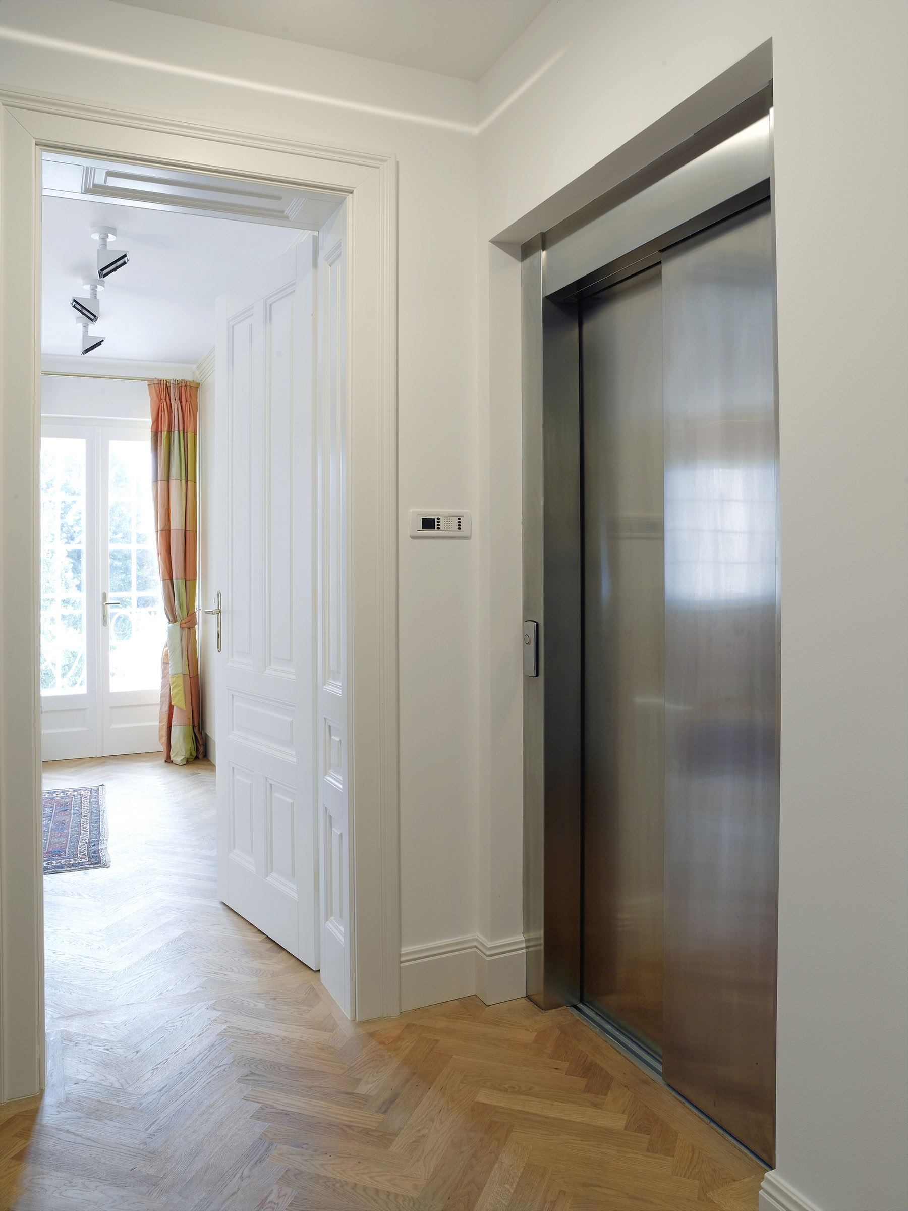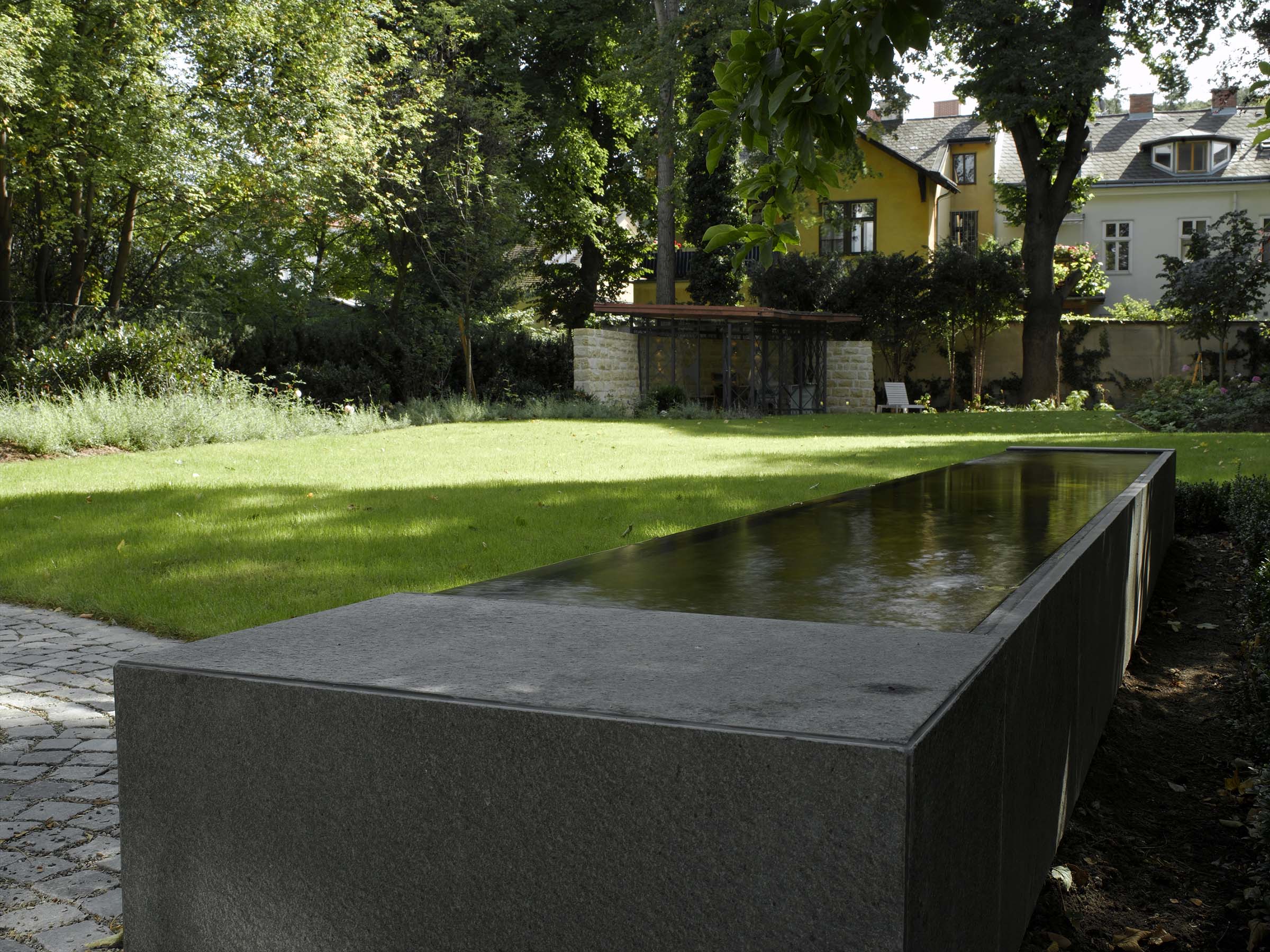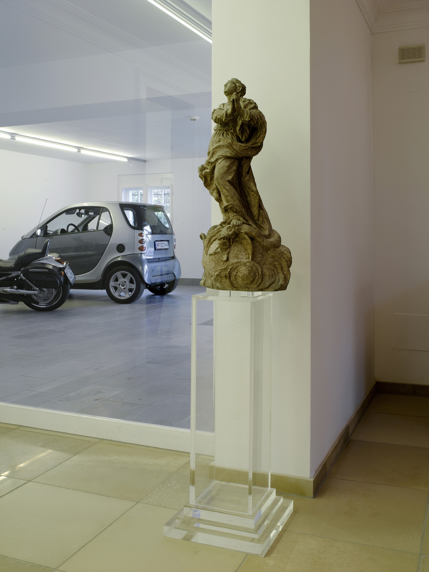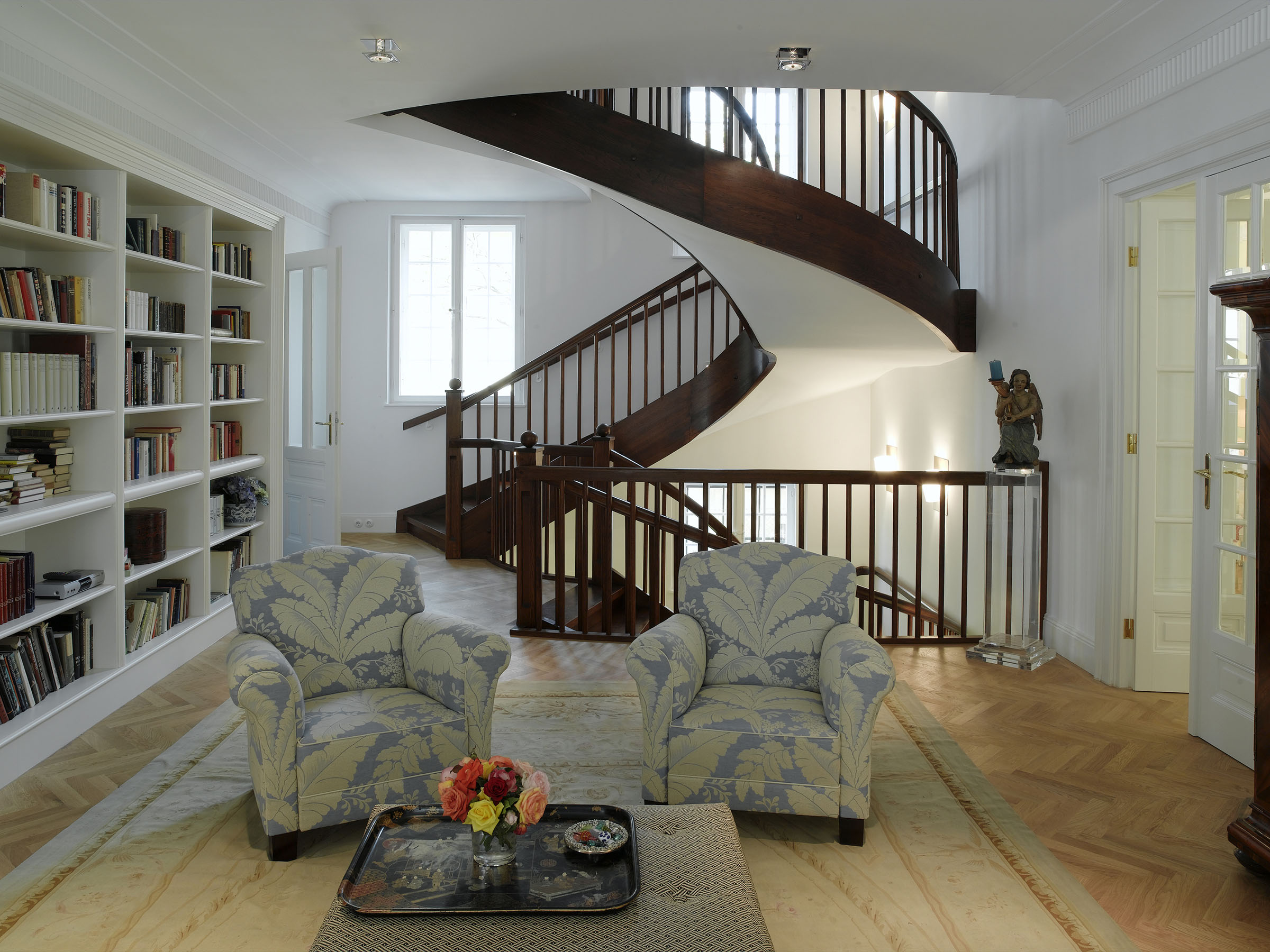 A villa adapted for office purposes was restored to residential use. An eccentric detail, the garage behind the facade, was rebuilt. The installation of a glass wall produced a ground-level axis view through the entire house into the garden. The constructional closing of a loggia solved structural problems of lighting and floor plan. From here, you also have a view of the new garden pavilion at the end of the garden.