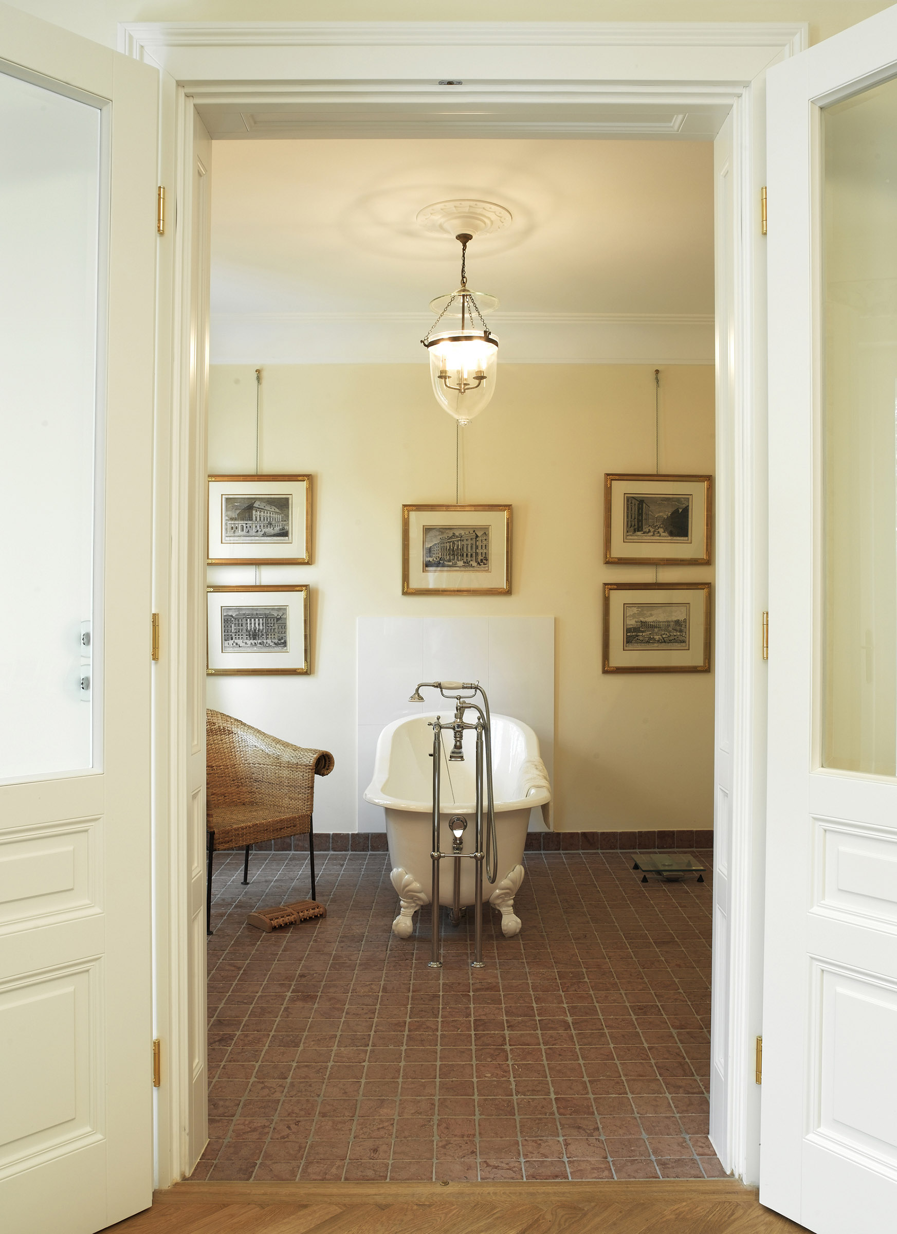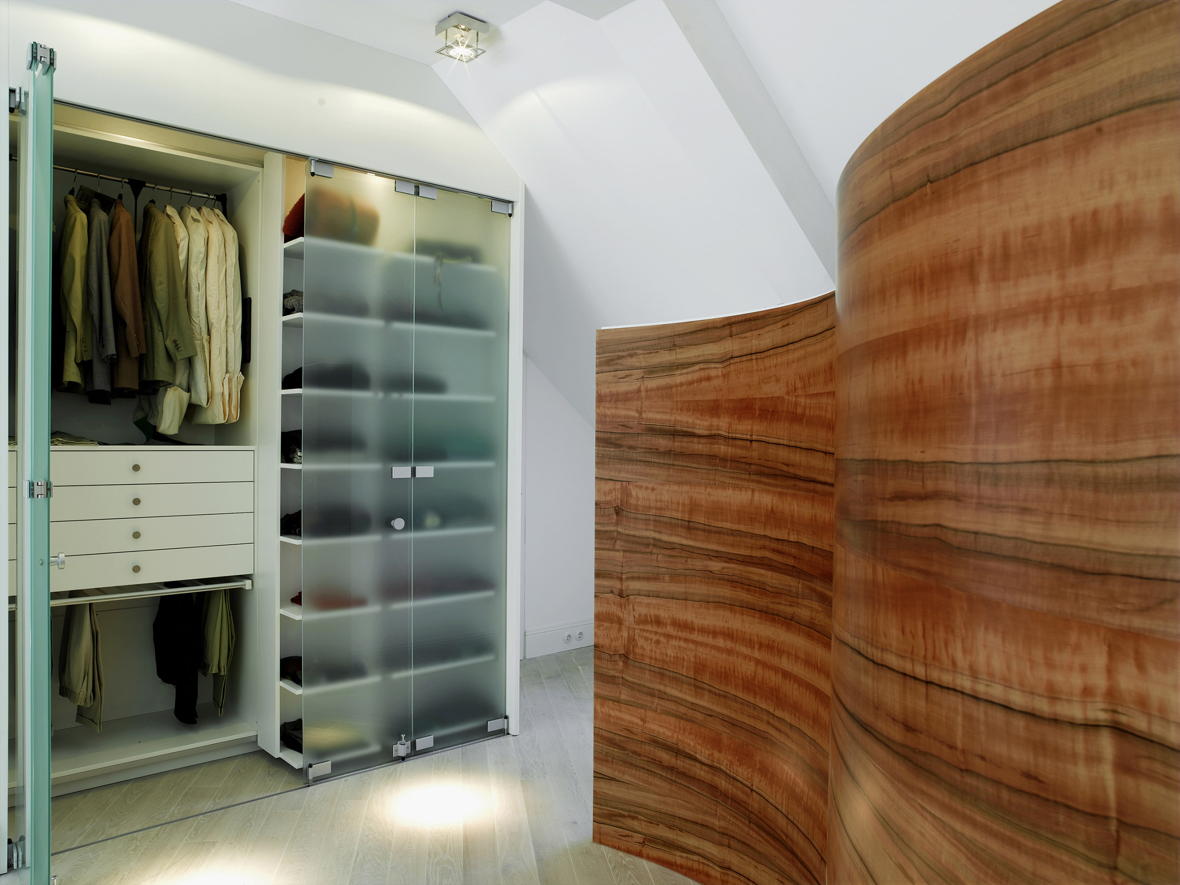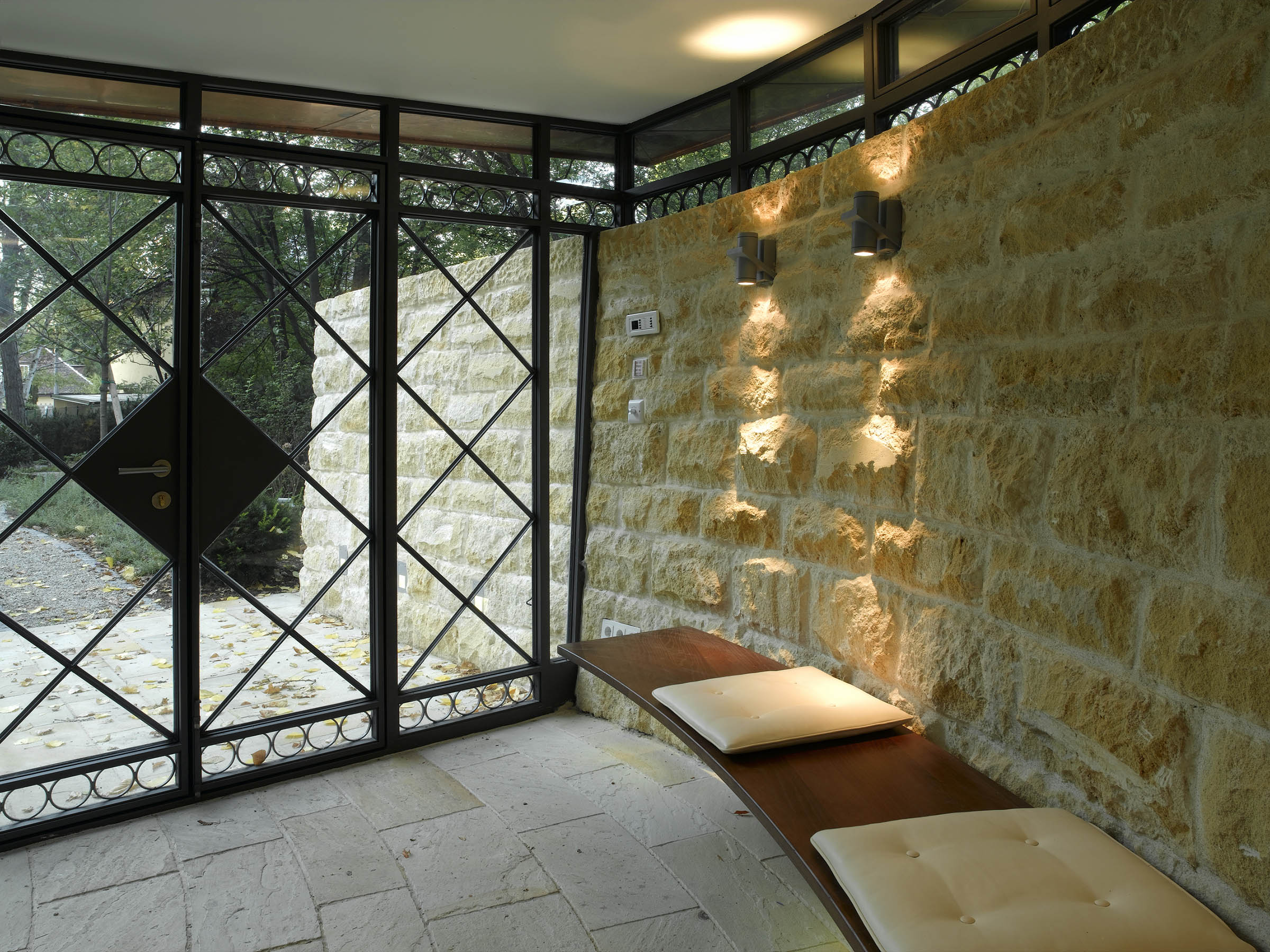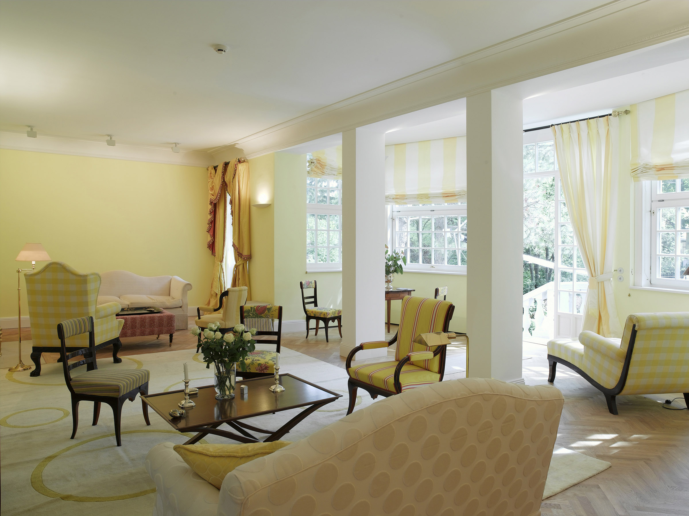 A villa adapted for office purposes was restored to residential use. An eccentric detail, the garage behind the facade, was rebuilt. The installation of a glass wall produced a ground-level axis view through the entire house into the garden. The constructional closing of a loggia solved structural problems of lighting and floor plan. From here, you also have a view of the new garden pavilion at the end of the garden.