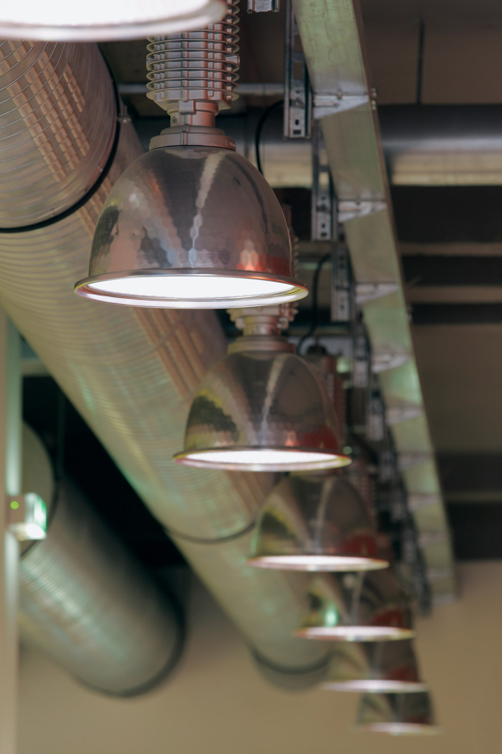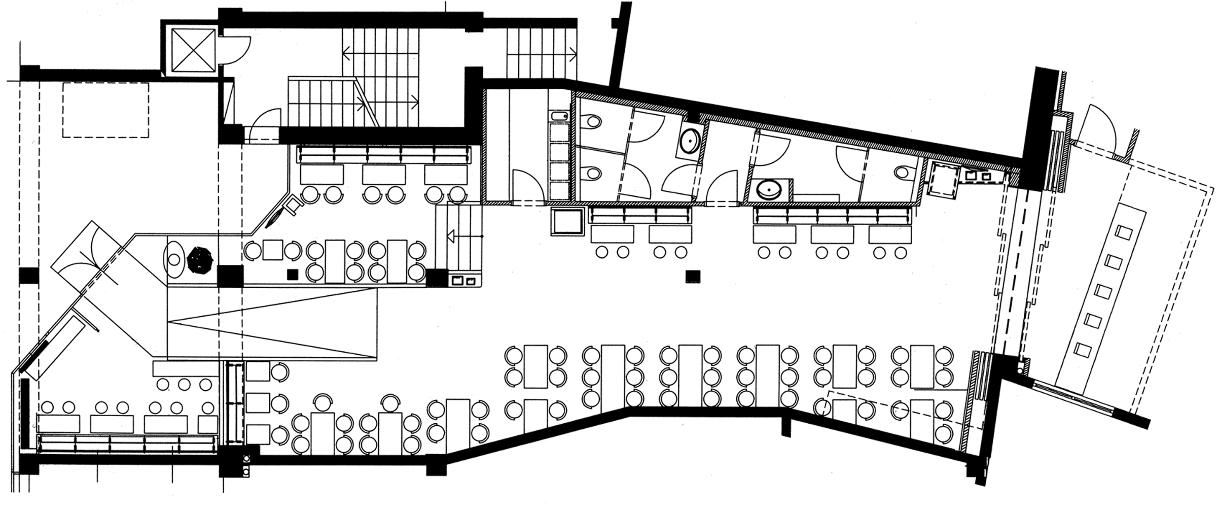 Ein lang gestreckter, unübersichtlicher Raum mit gebrochenen Konturen und fast ohne Tageslicht wurde hier „auf Achse“ gebracht und neu geordnet. Die sichtbar belassene Technik an der Decke „erstmals in einer McDonald’s-Filiale“ bringt ein „raues“, stark skulpturales Element ein. Bei der Ausstattung und Möblierung standen die Robustheit und Belastbarkeit von Materialien und Oberflächen im Vordergrund.