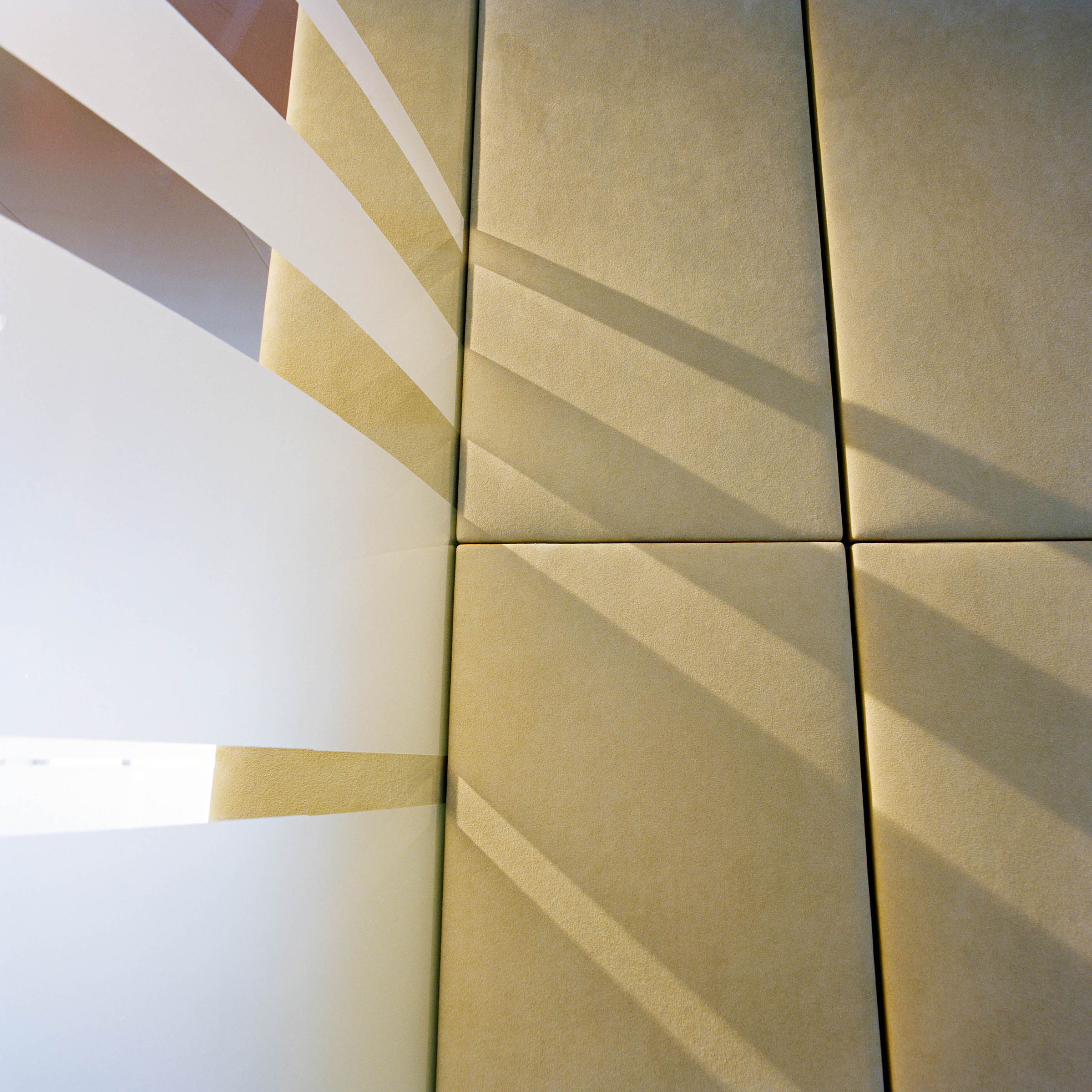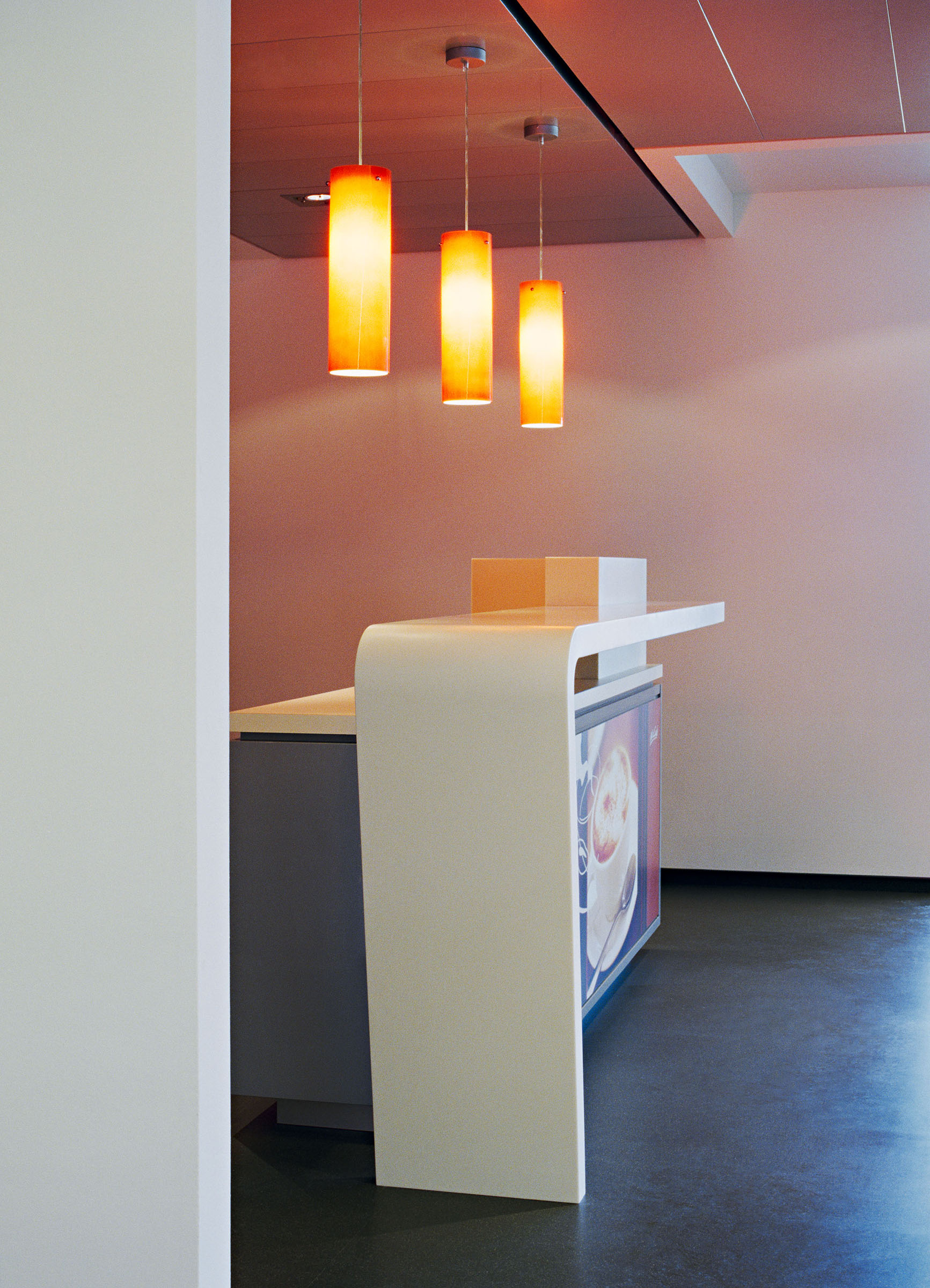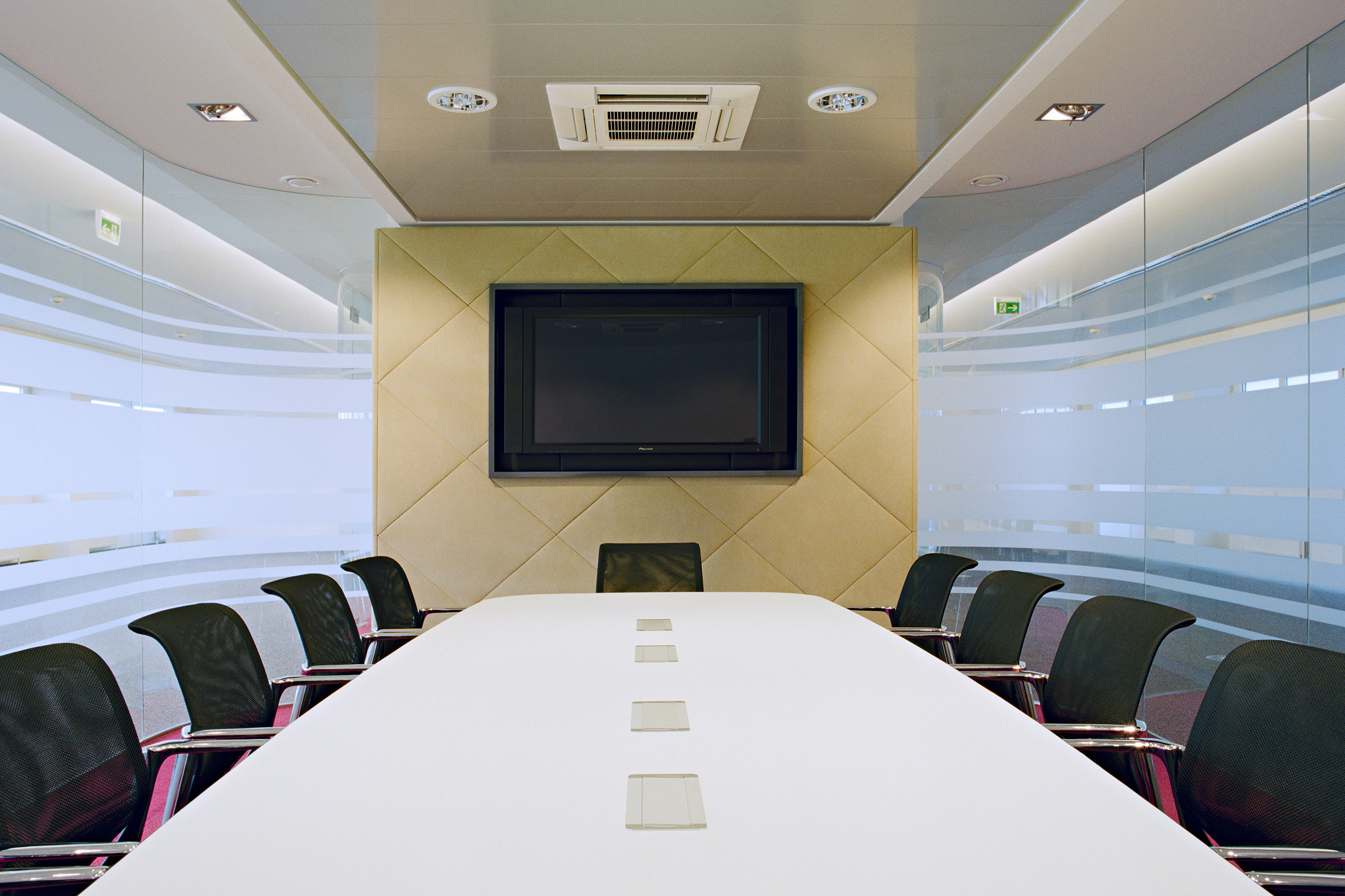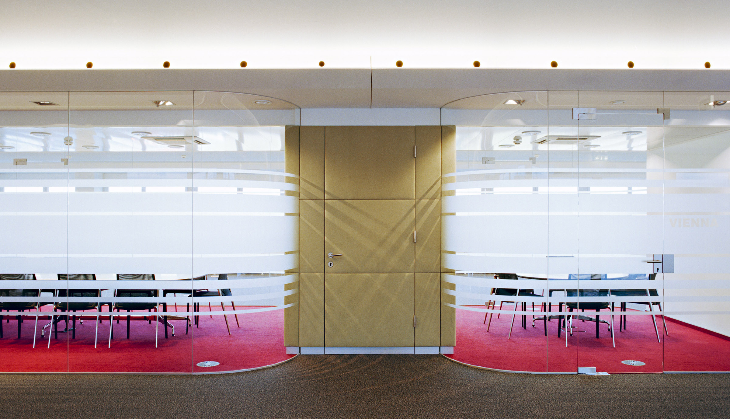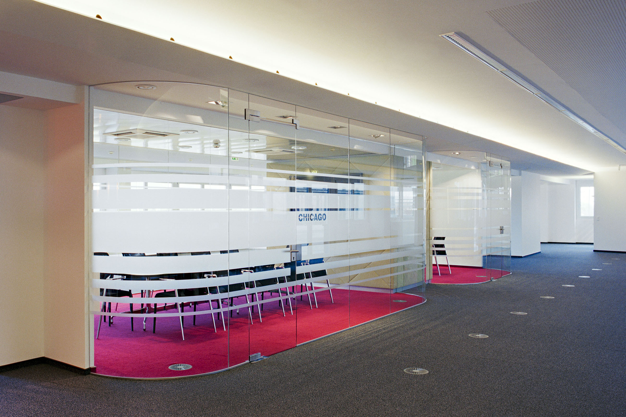 Der vorgefundene Grundriss machte im Gebäudeinneren liegende Besprechungsräume nötig. Diese Räume wurden mit gebogenen, zum Teil mattierten Glaswänden lichtdurchlässig, aber nicht völlig transparent gestaltet, so dass ein gewisser Grad an Privatheit bei gleichzeitiger Verbesserung der Lichtsituation erzielt werden konnte. Offenheit und Transparenz als Unternehmenssignal konnten so in die Gestaltung eingebunden werden.