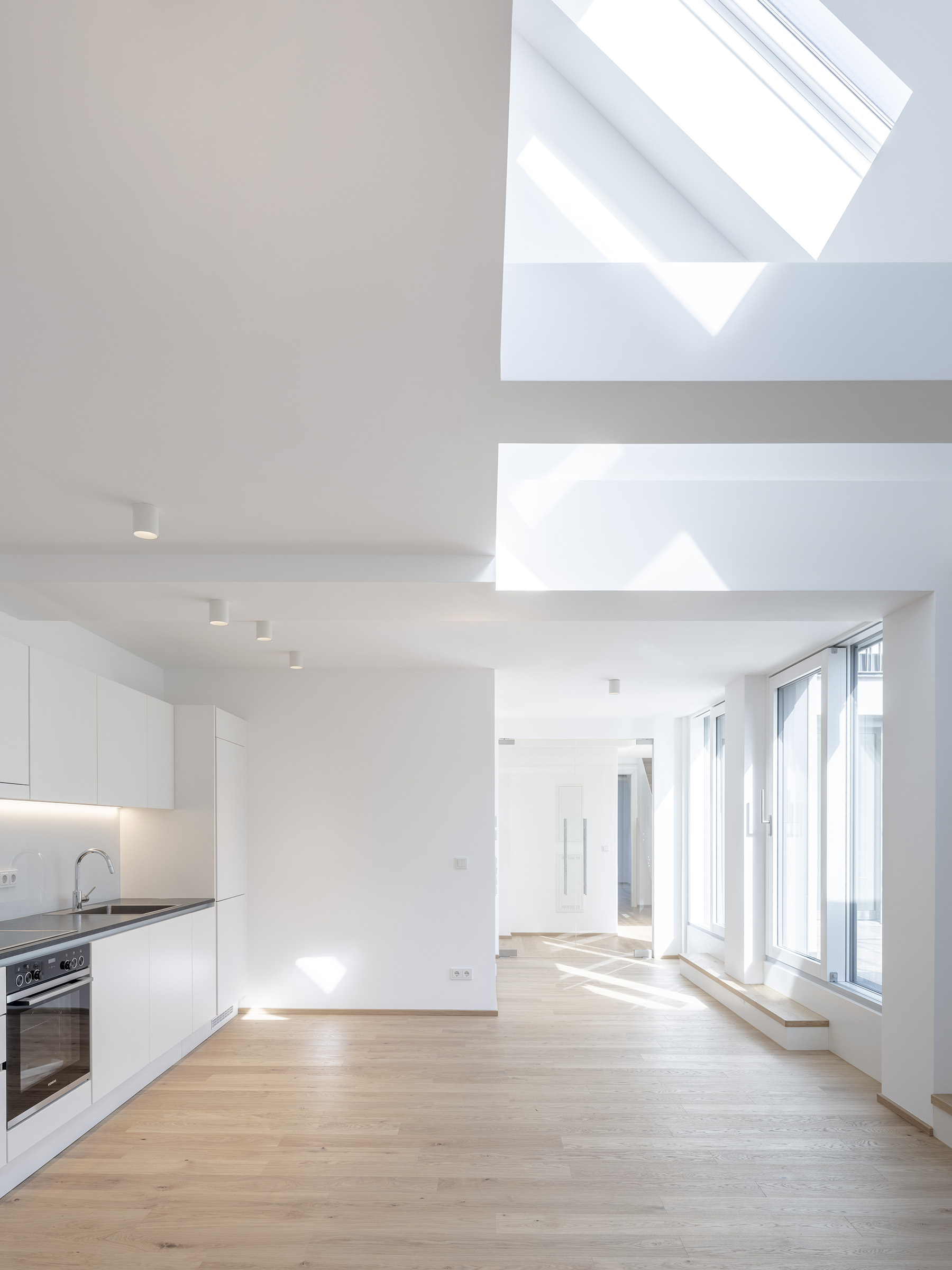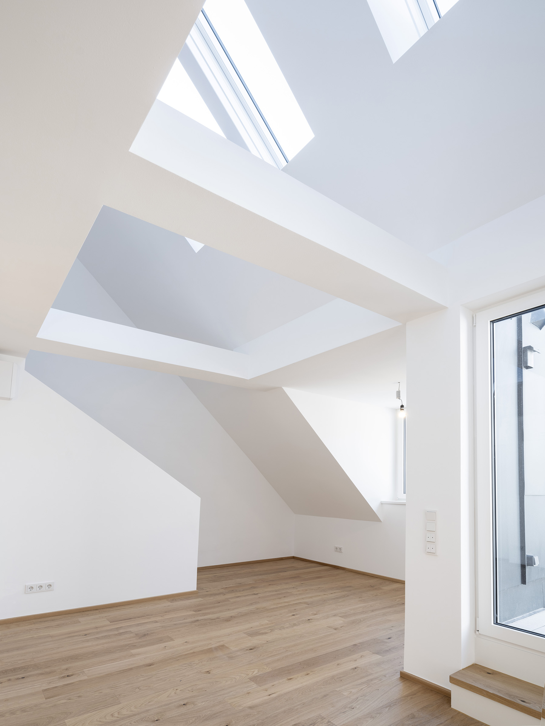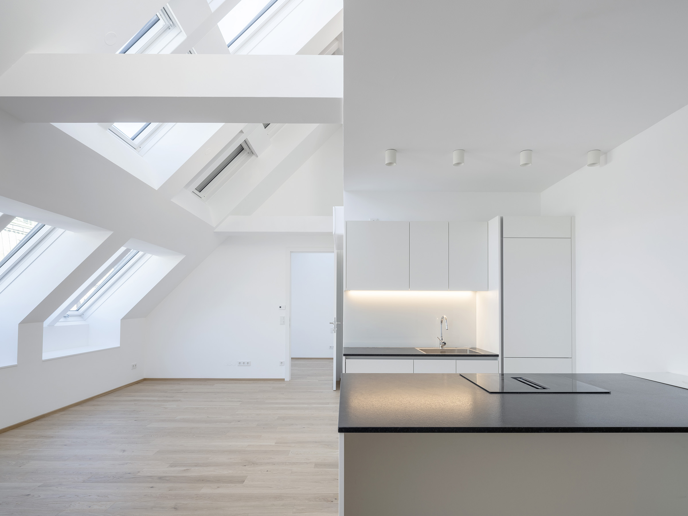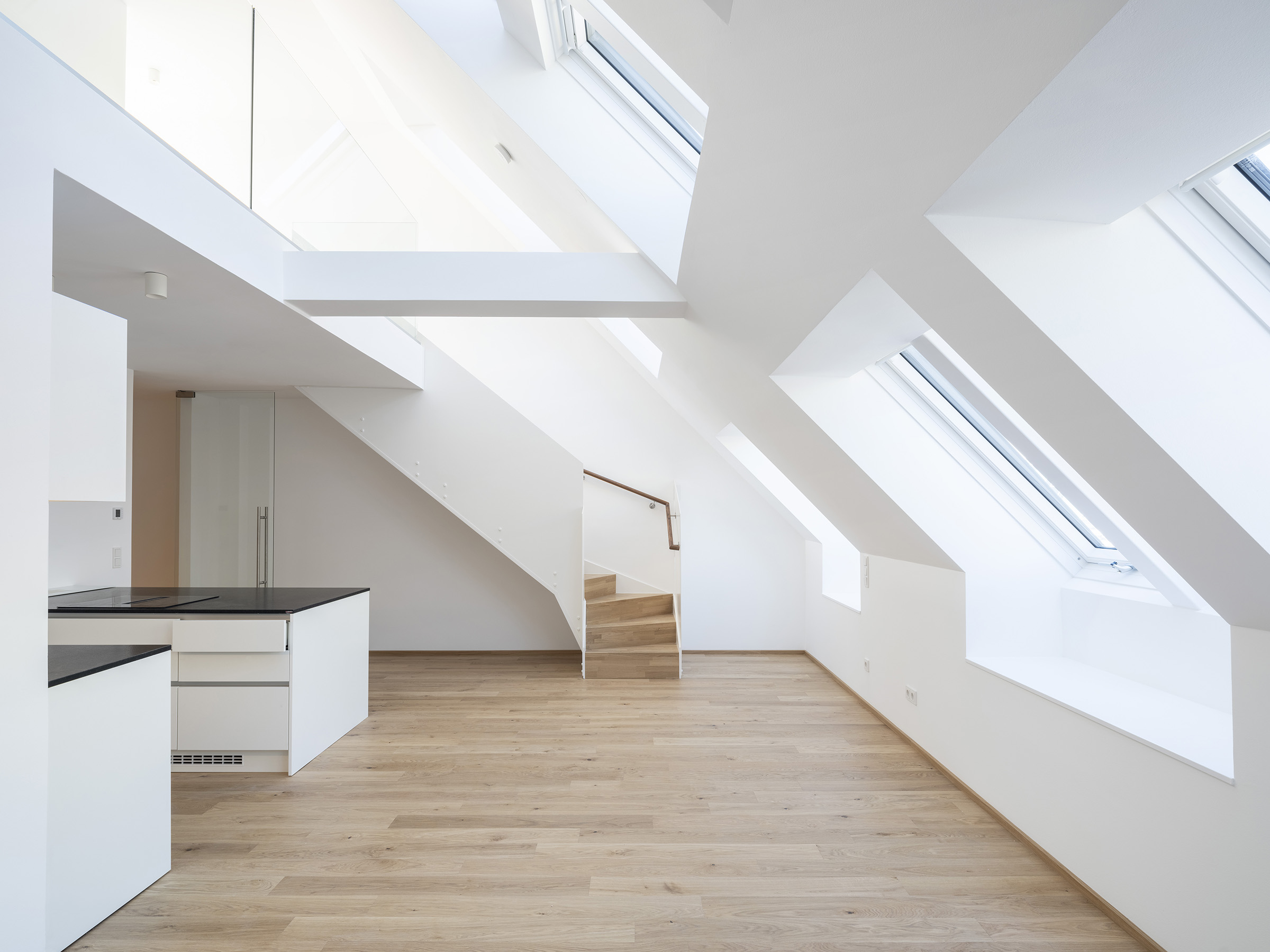Im Gründerzeithaus im Rathausviertel im ersten Wiener Gemeindebezirk wurden im Dachgeschoß drei exklusive Wohnungen mit insgesamt sieben Terrassen geplant und umgesetzt. Durch ein kreatives architektonisches Konzept entstanden drei kompakt geschnittene Wohneinheiten mit großzügigen Galerieflächen. Die offene Raumstruktur wird durch sichtbare Balken und beeindruckende Durchblicke geprägt. Die Terrassen befinden sich auf unterschiedlichen Ebenen und dienen als verbindende Elemente. Auf der obersten Terrasse wird man mit dem Blick auf das Rathaus und den Wienerwald belohnt.