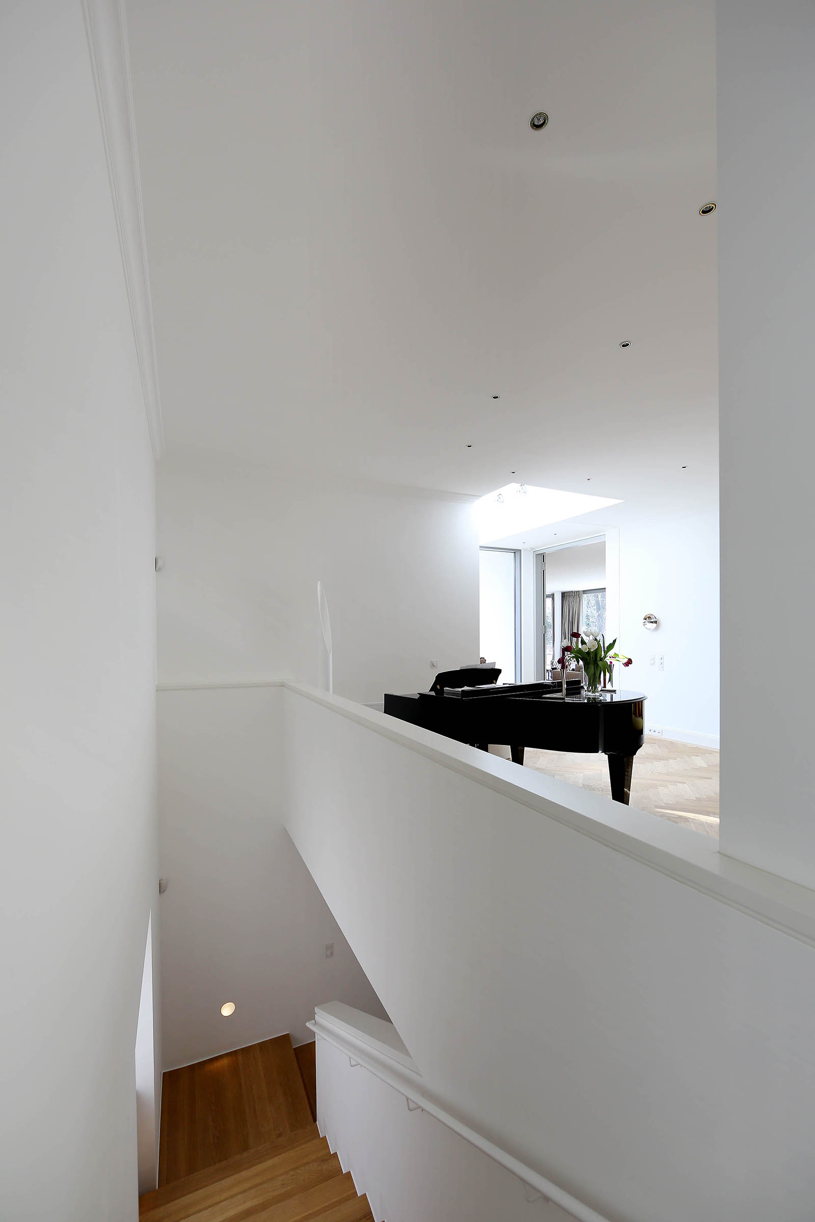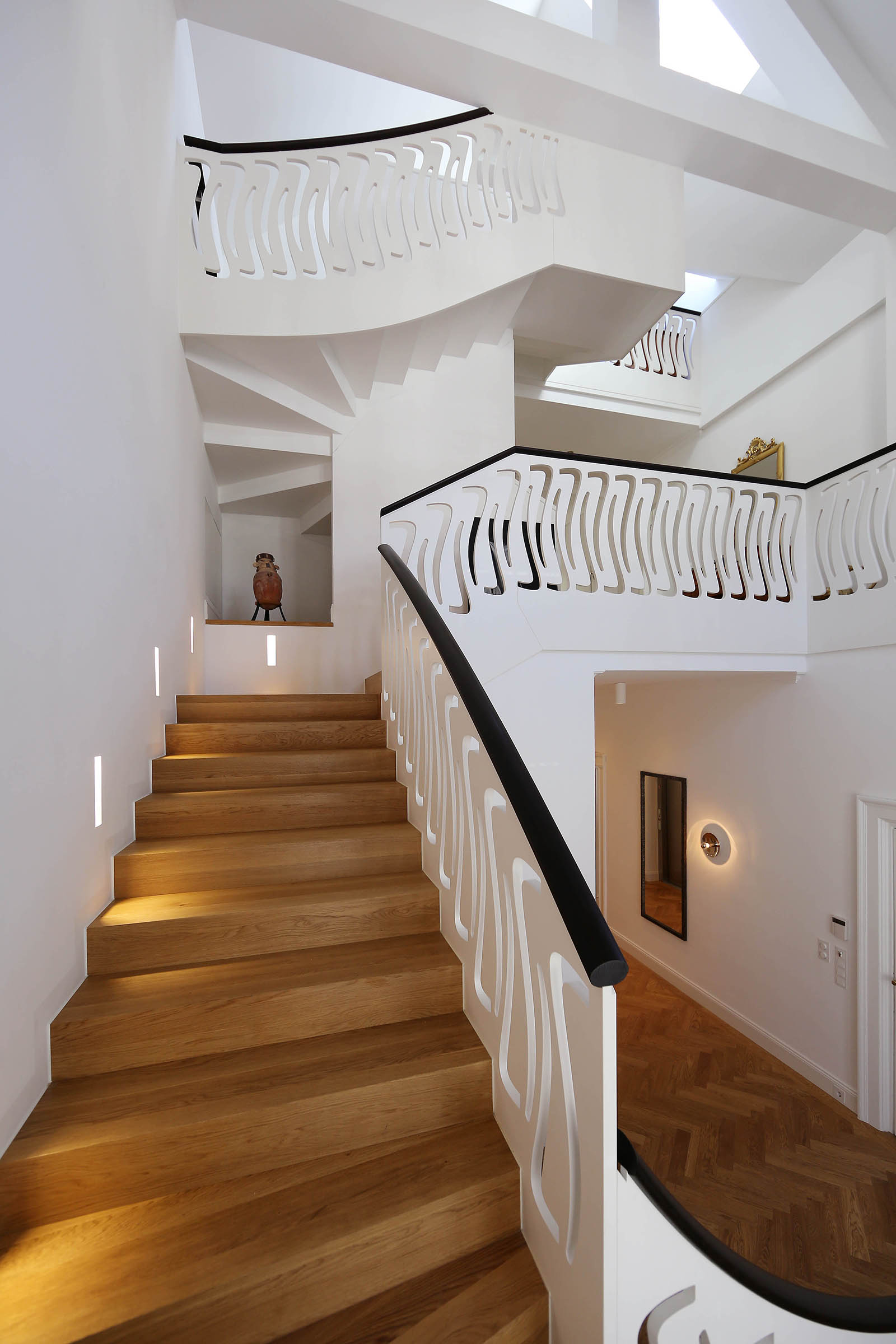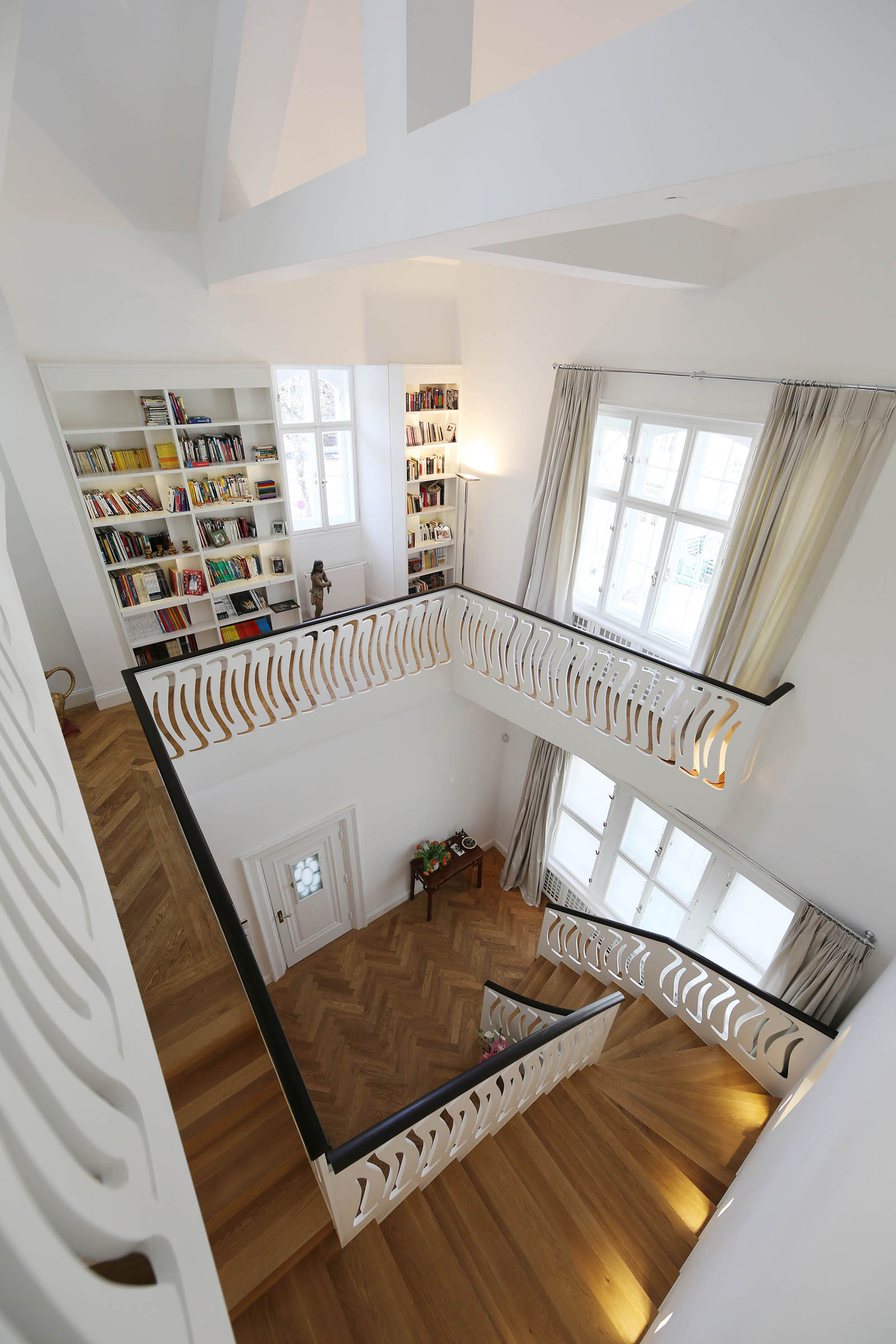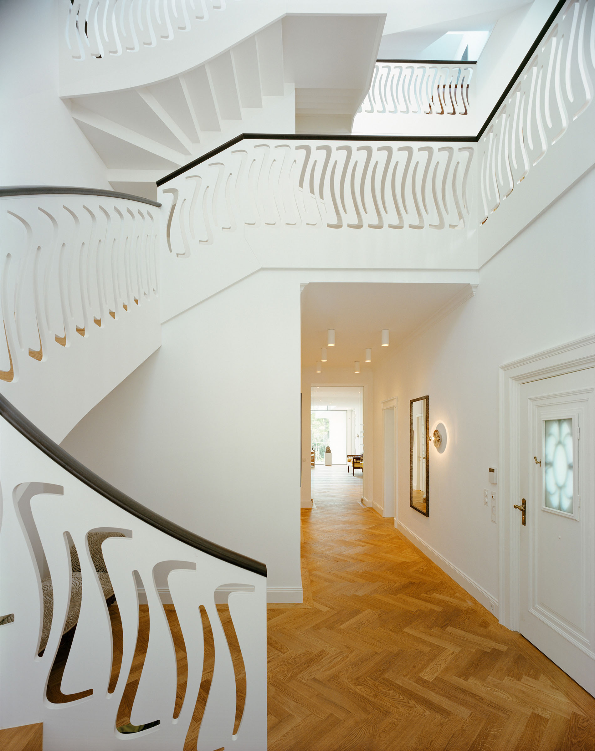 Die komplette Neustrukturierung des Hauses schafft ein neues Raum- und Wohngefühl. Ein Zubau wurde abgebrochen und neu errichtet. Zu den Highlights des Umbaus zählen das neue Treppenhaus und die großzügige Eingangshalle. Eine Textzeile aus dem Lieblings-Chanson der Bauherrin war der Ausgangspunkt für eine sehr persönliche Symbolik, deren Leitmotiv mehrfach an der Geländer-Elementen zum Einsatz kam.