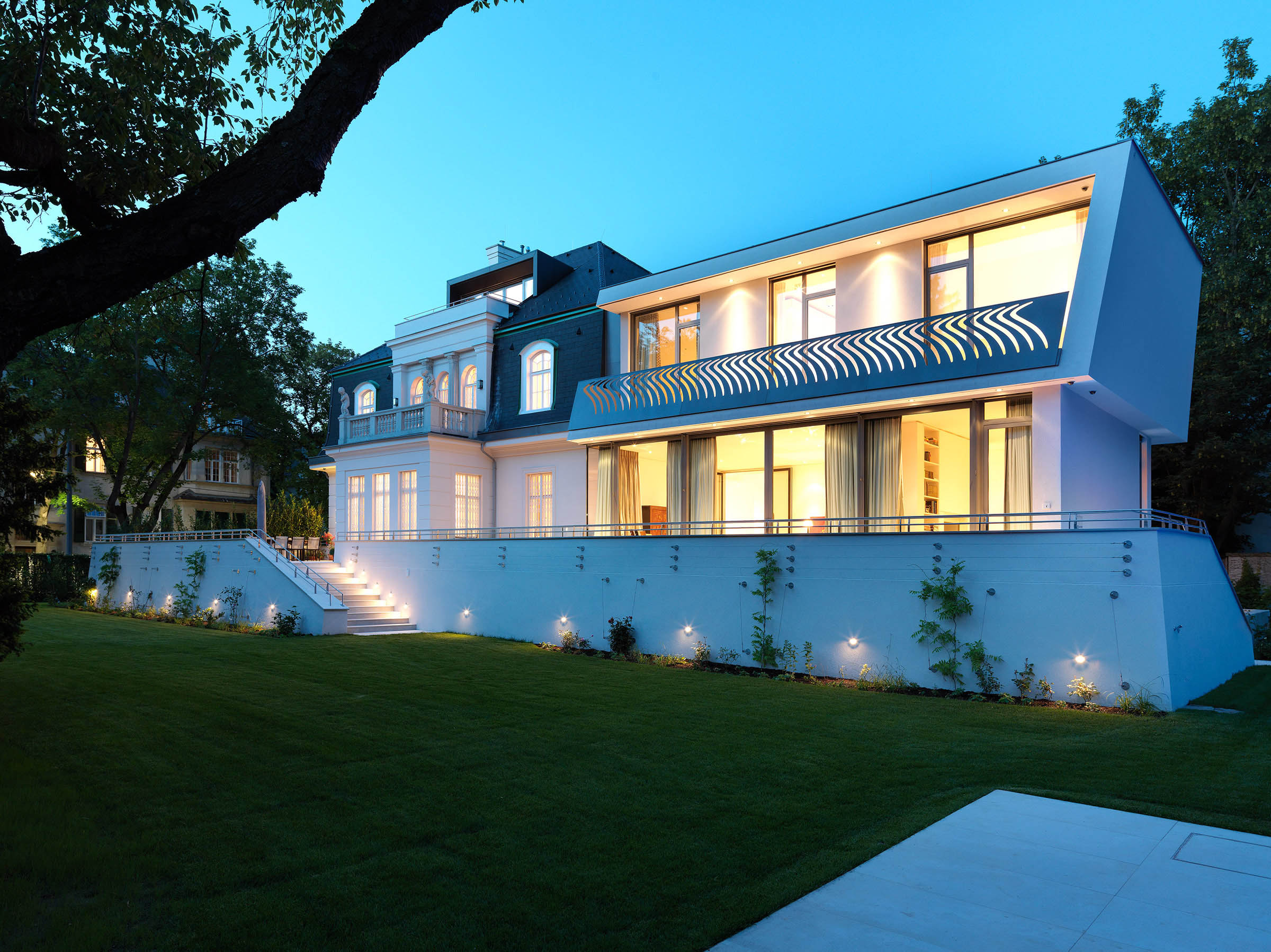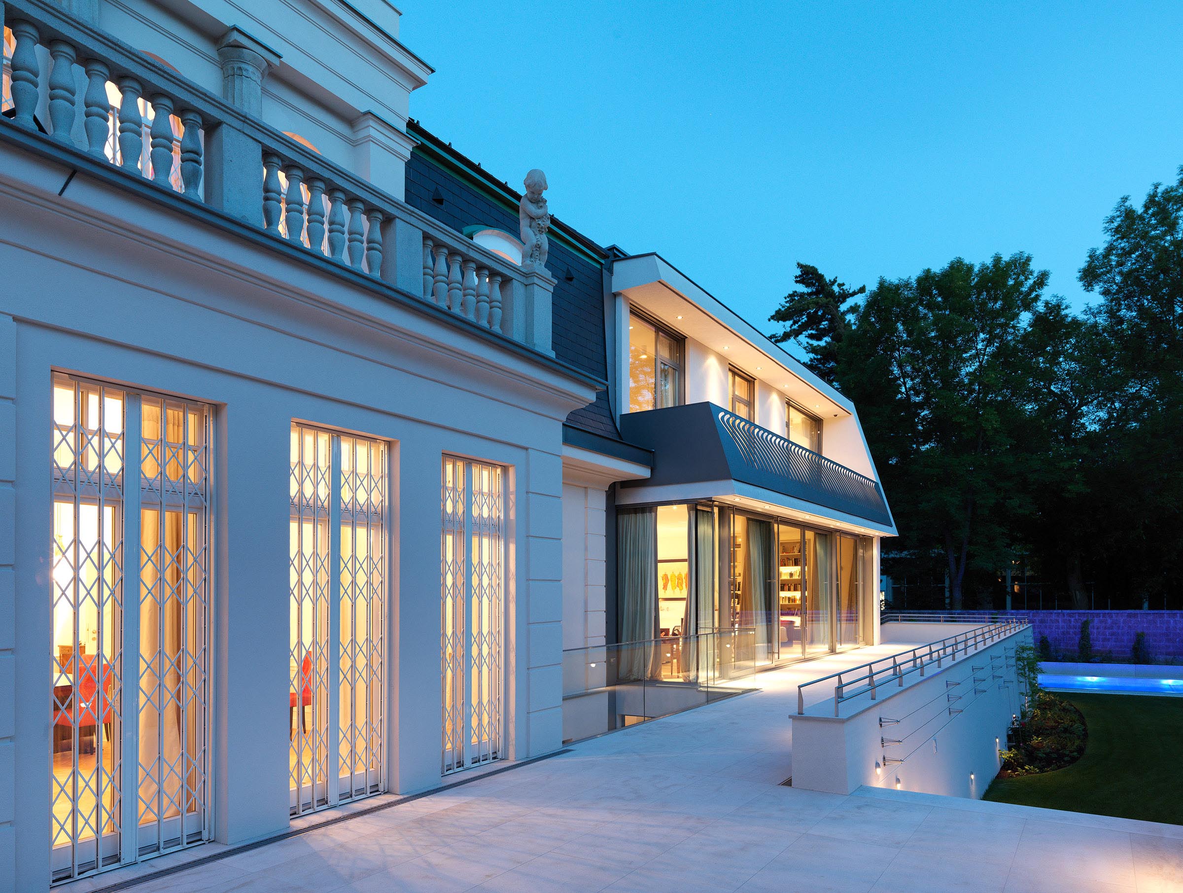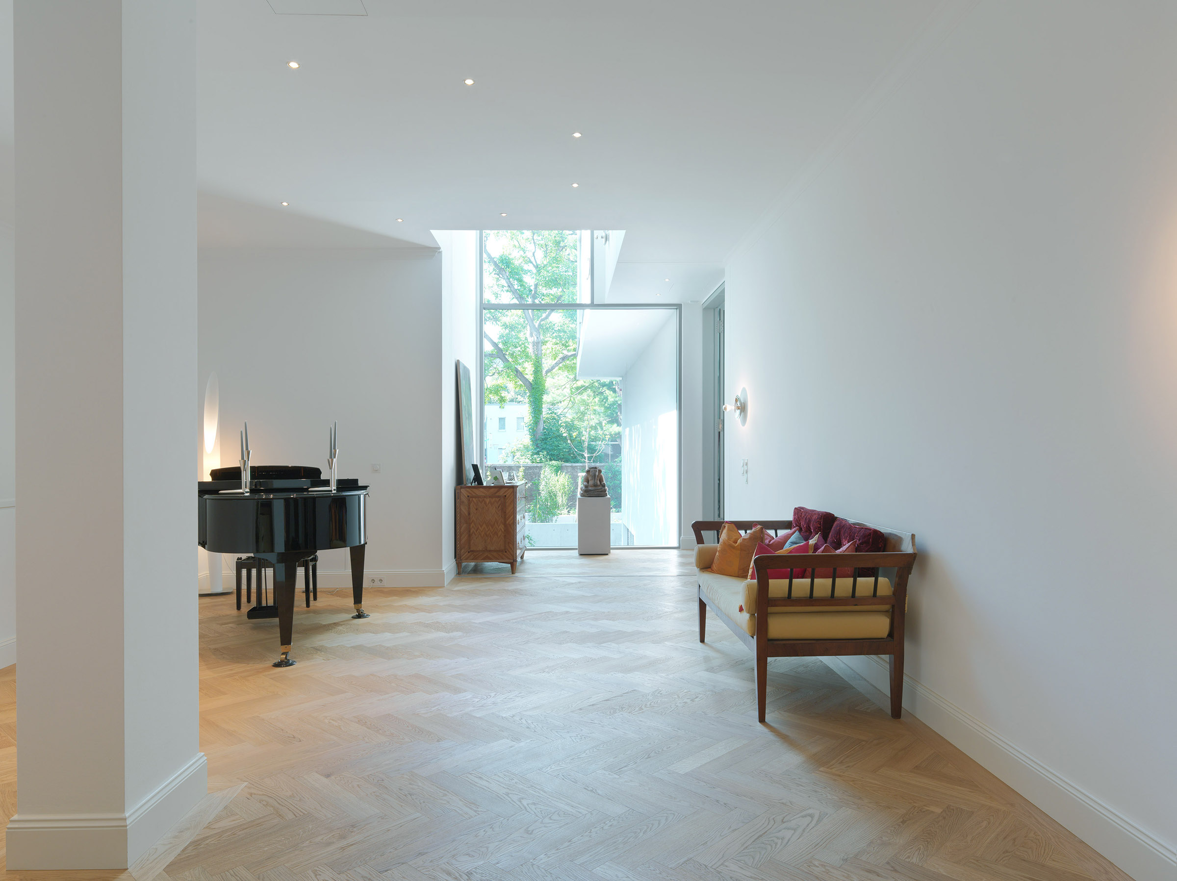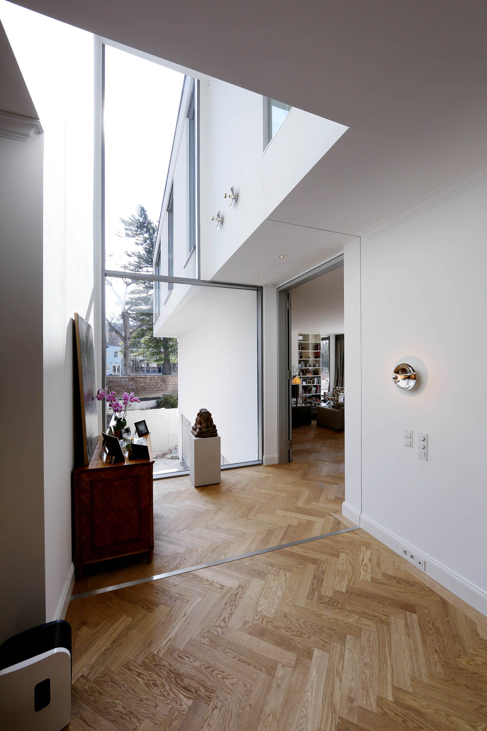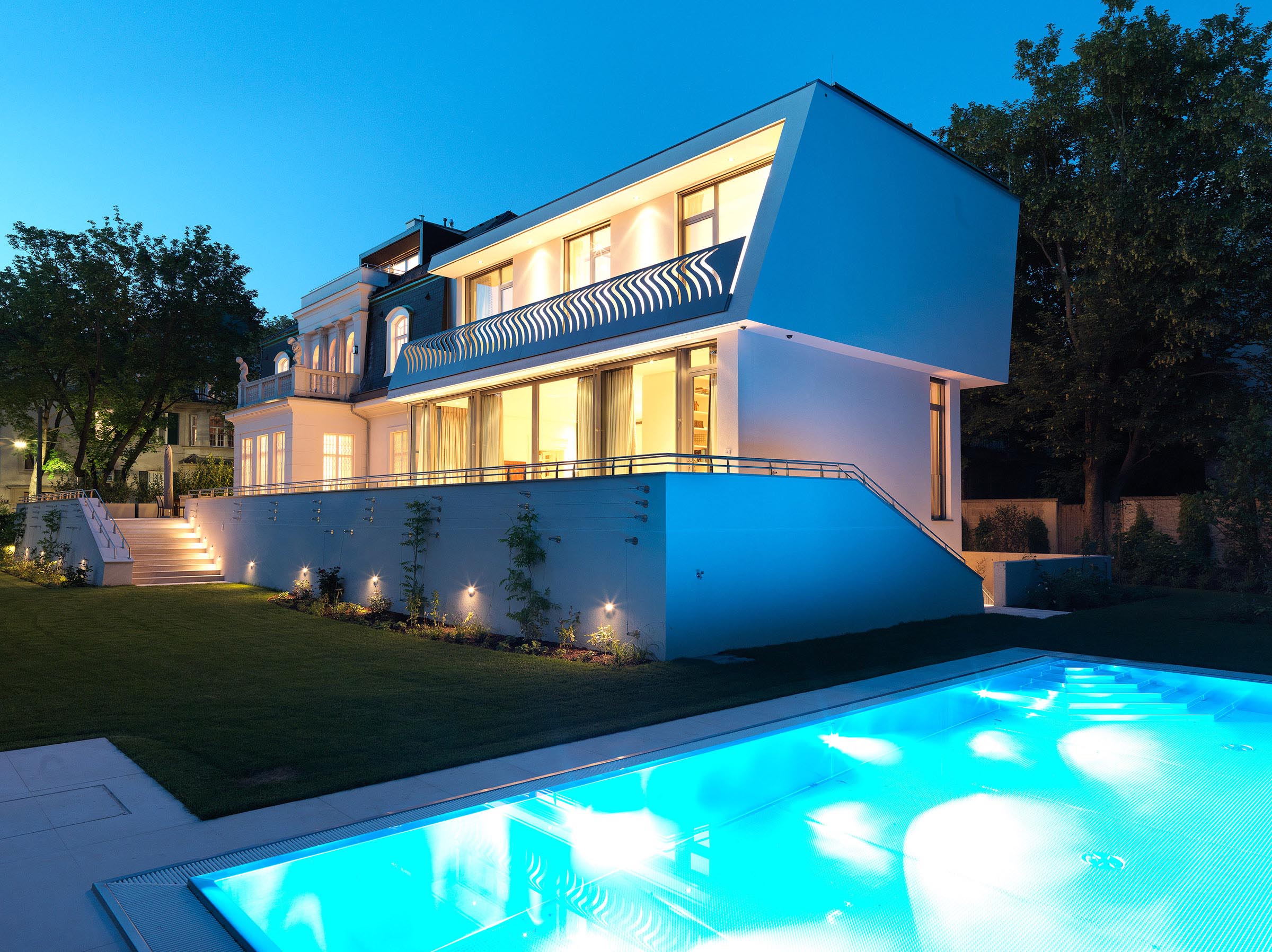 Die komplette Neustrukturierung des Hauses schafft ein neues Raum- und Wohngefühl. Ein Zubau wurde abgebrochen und neu errichtet. Zu den Highlights des Umbaus zählen das neue Treppenhaus und die großzügige Eingangshalle. Eine Textzeile aus dem Lieblings-Chanson der Bauherrin war der Ausgangspunkt für eine sehr persönliche Symbolik, deren Leitmotiv mehrfach an der Geländer-Elementen zum Einsatz kam.
