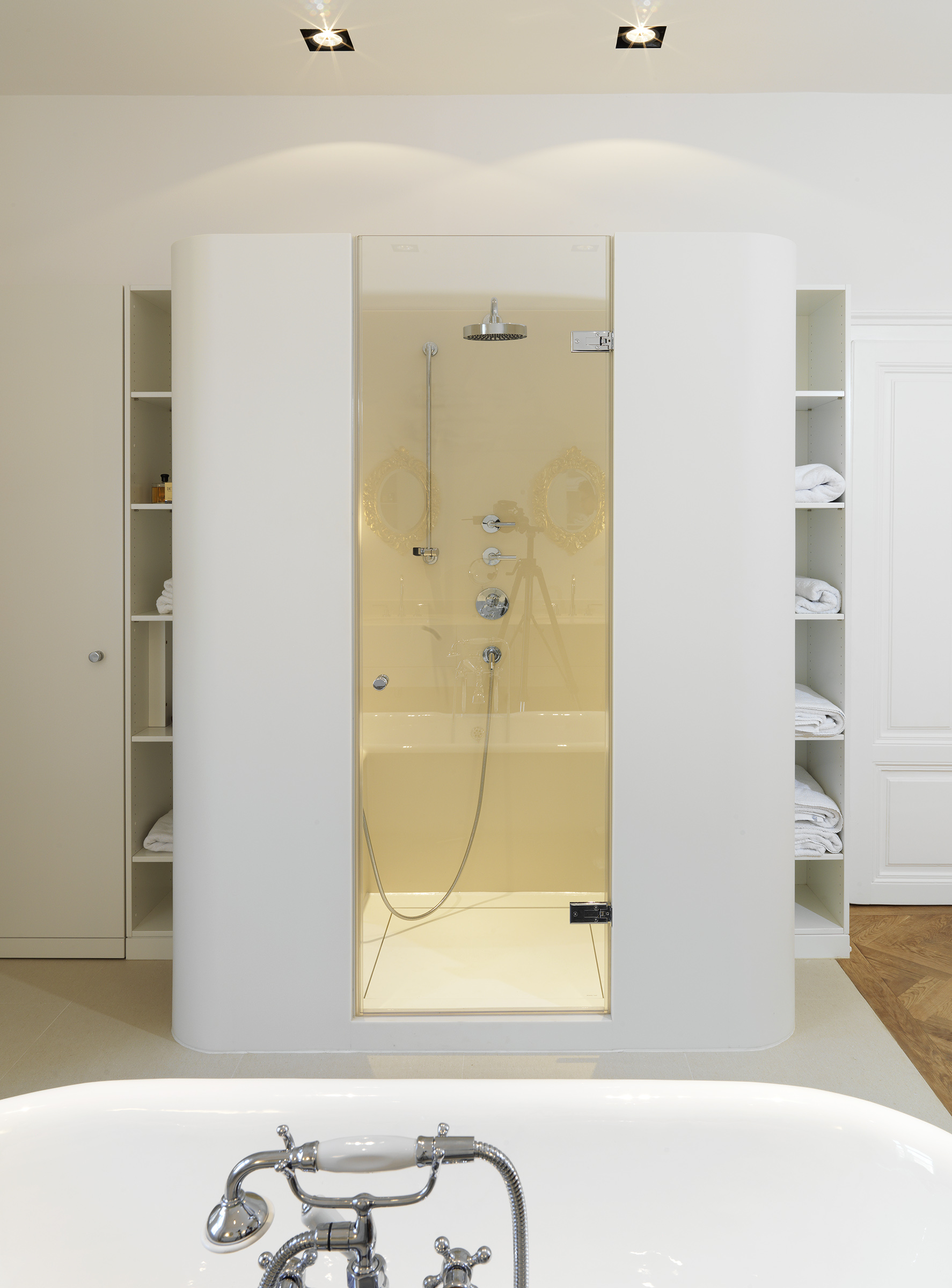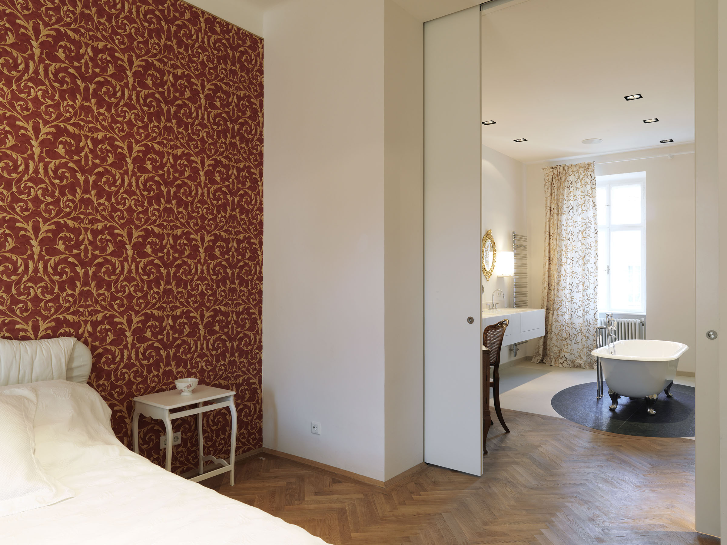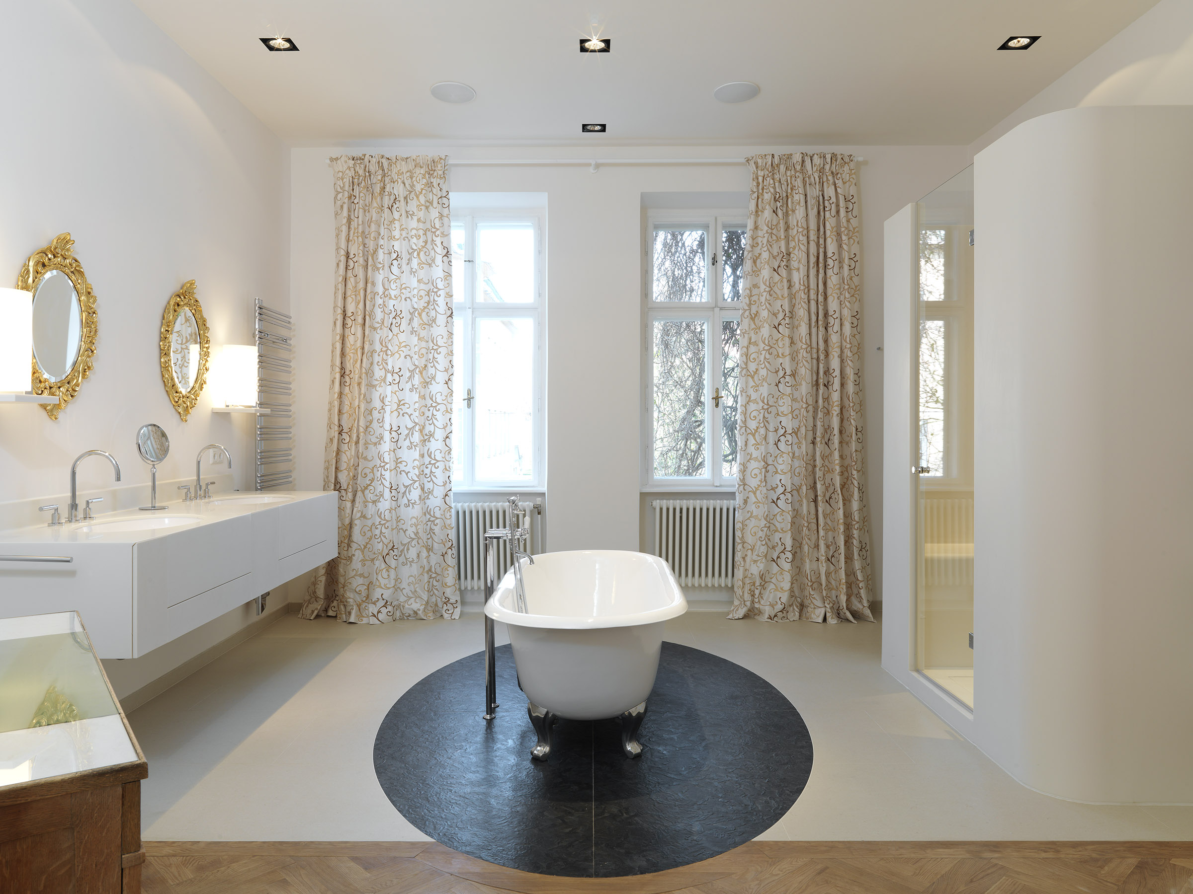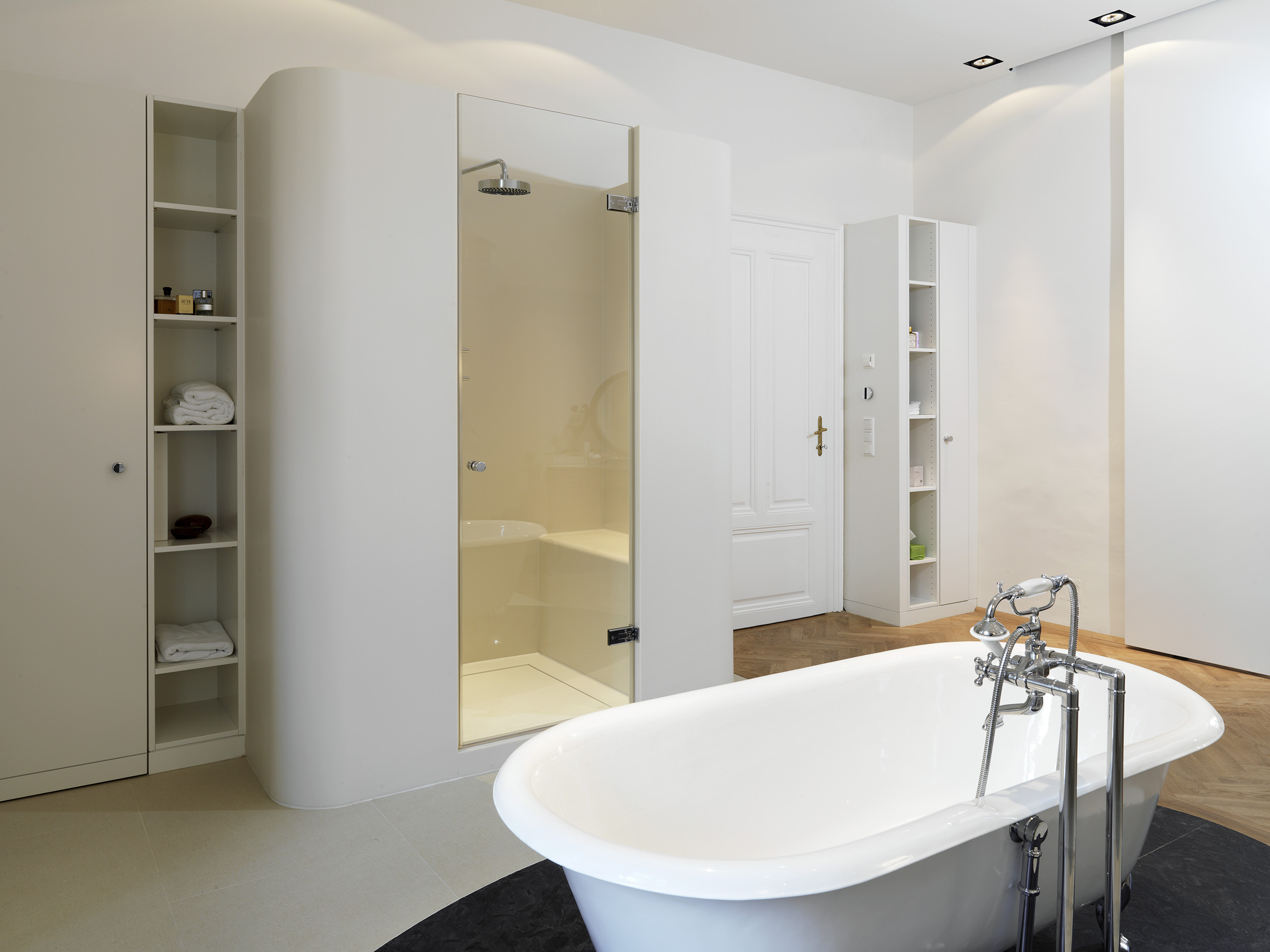 Im Wiener Cottage, einem auf Planungen des Ringstraßenarchitekten Heinrich von Ferstel zurückgehenden durchgrünten Wohngebiet, wurde eine Villa aus der Zeit um 1875 adaptiert. Der schlichte, klar organisierte Bau konnte mit einigen baulichen Eingriffen modernen Standards angepasst werden. Eine Hauptrolle bei diesem Makeover spielt die maßgeschneiderte Ausstattung, die eine helle und heitere Grundstimmung schafft. Der Parkettboden sorgt für einen fließenden Übergang zwischen Schlaf- und Badezimmer, dessen Hauptakzent die frei auf einer Steinscheibe aufgestellte Badewanne bildet.